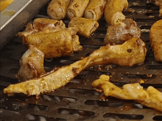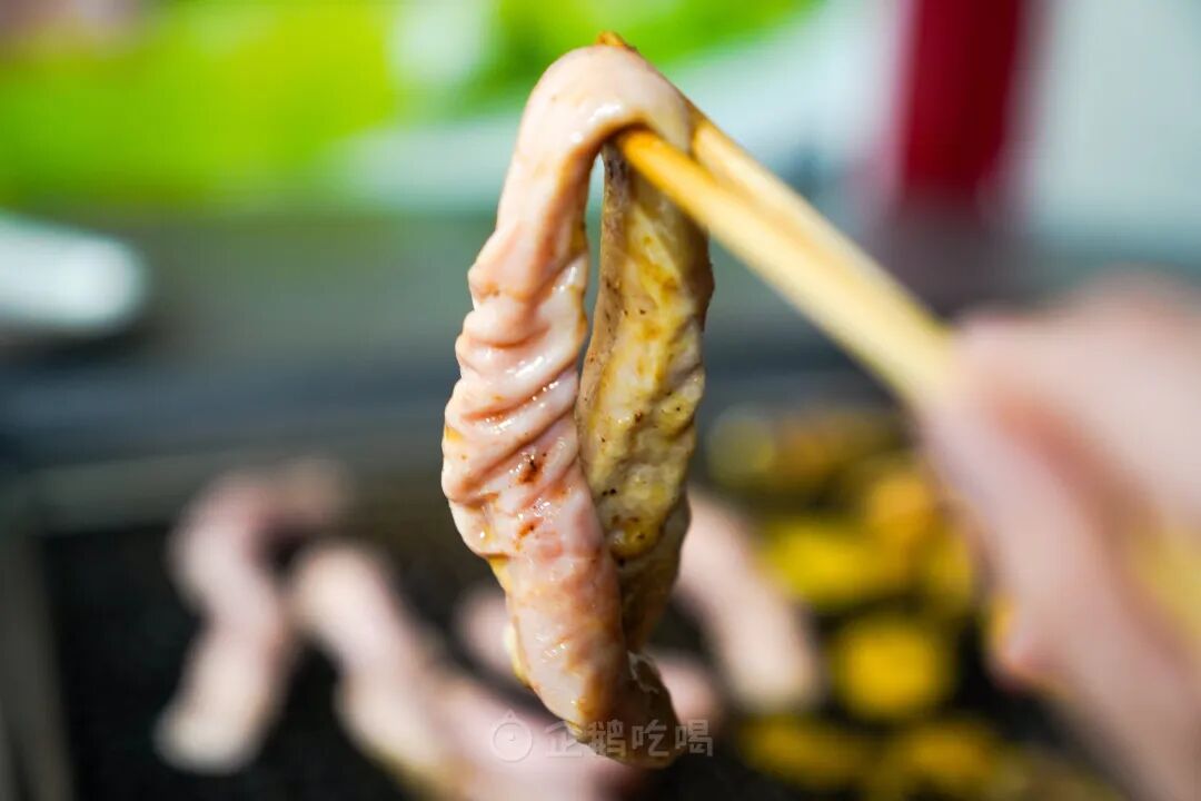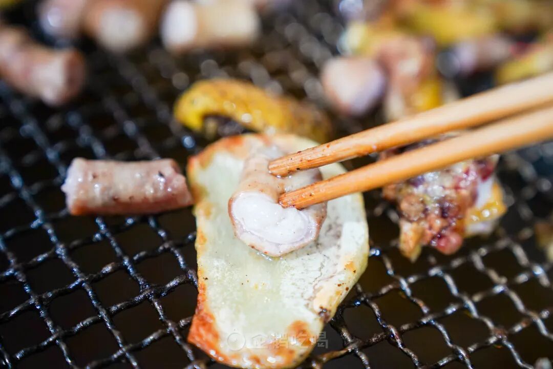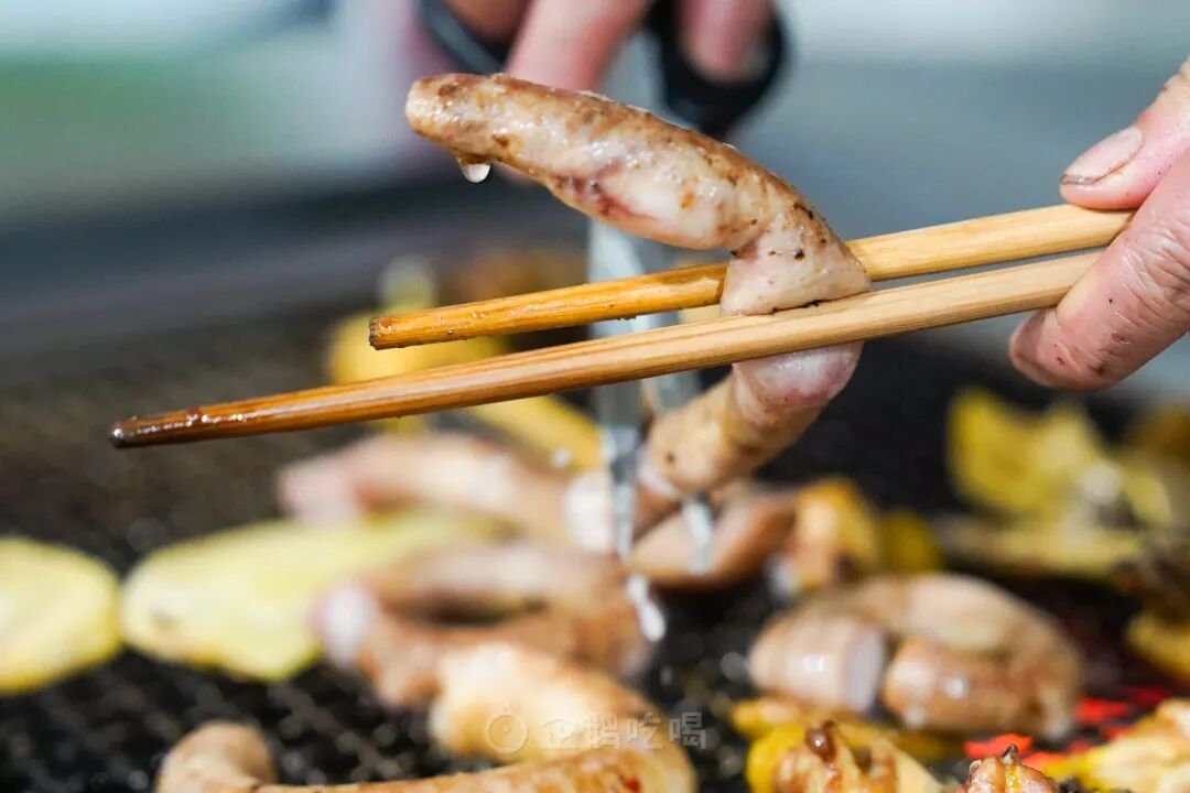 外层的脂肪滋滋作响,金黄的小肠在烤盘上蹦跳,里层的脂肪渐渐融化,夹起一个,你有2种选择: