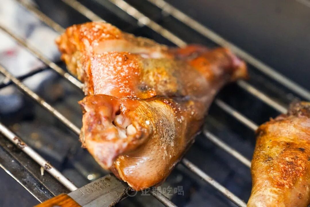 整只猪头一劈两半,一大块直接上火烤!手臂长的猪脚,可选前后,前腿肉多后脚皮多,肉香皮脆......