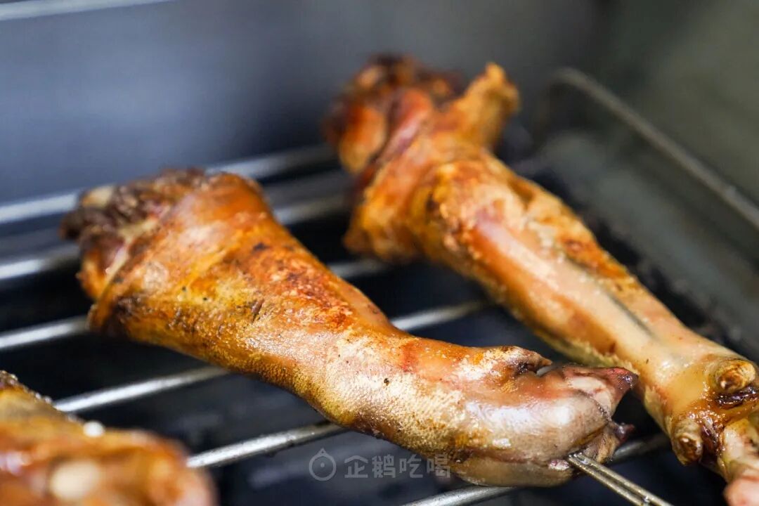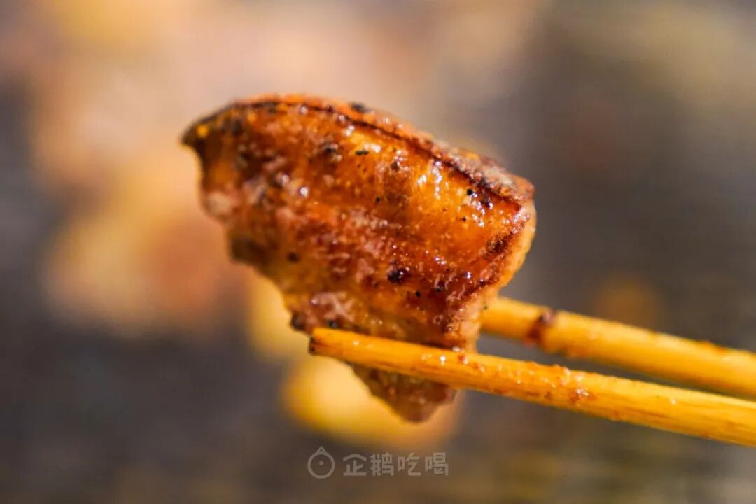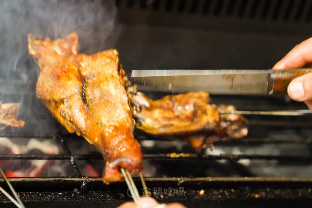 老板就会专门把皮放到离火焰更近的位置,烤走更多的脂肪。不用担心烤糊发苦,在快要烤熟之际,细心用小刀刮去焦色,其深沉香气,吃过一次就终生难忘。