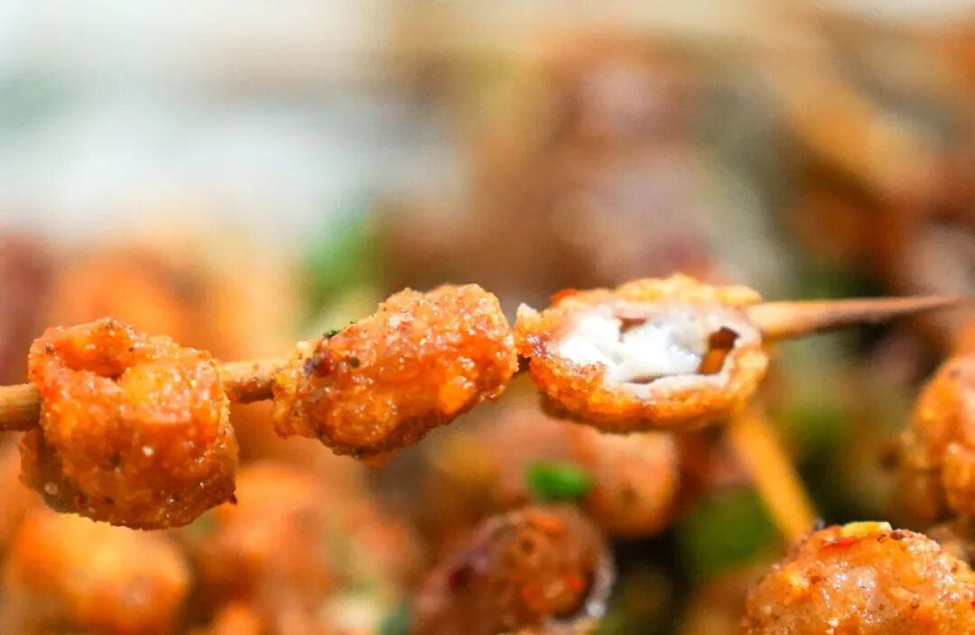 西昌大部分串烧烧烤店,处理猪小肠的方式是反复清洗→切成小段→腌制→串串;但老字号赵烧烤不同,老板受四川酥肉的启发,在串串前增加了一个滚蛋清和裹淀粉的工序,这正是赵烧烤的秘密武器。