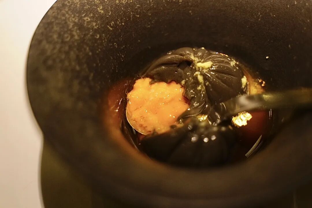 最近吃到的一道,是取用柑香出色的12年梅江塞口陈皮,会将小青龙以两种做法呈现,先是将龙虾肉、陈皮与蛋白打成慕斯质感,再酿入竹笙中蒸成卷,吃起来像风味多层的鱼腐。另一种做法是将龙虾打成虾滑融入到自家制作的陈皮油,以类似天妇罗的做法酥炸,搭配着以纯鸡汤制作的汁酱,香气层层递进。