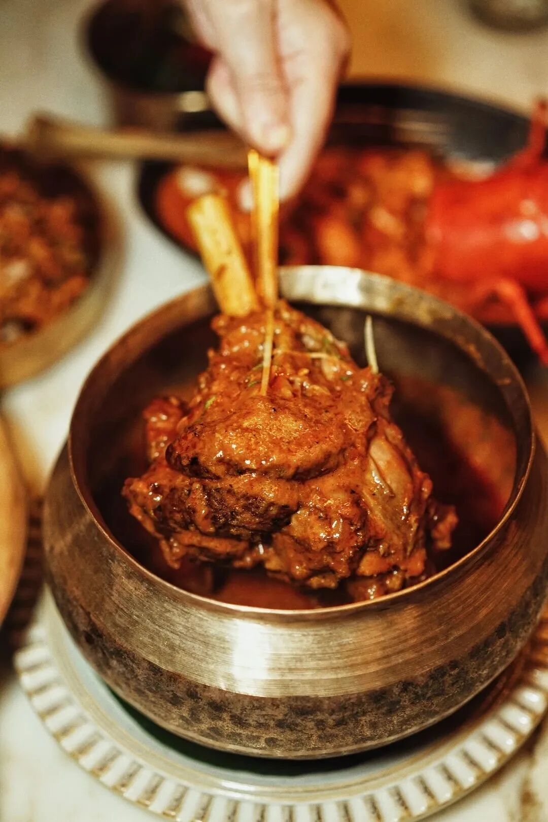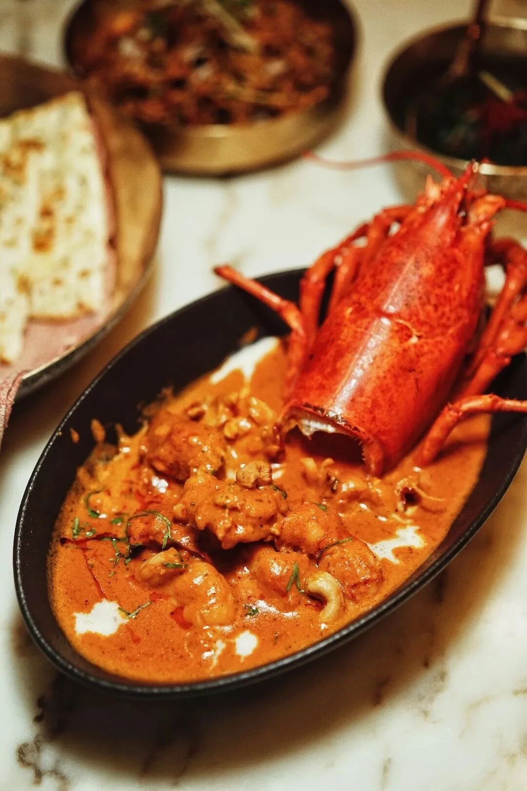 印象很深的是主菜「Lobster Champagne Makhani」,印度菜本无龙虾,但来到了海鲜之港,也就有了龙虾,搭配的是以当地名物Masala综合香料为主制作的汁酱,穿透一丝番茄的酸调,仅是这酱的馥郁已百转千回,引人拌上一大碗饭。