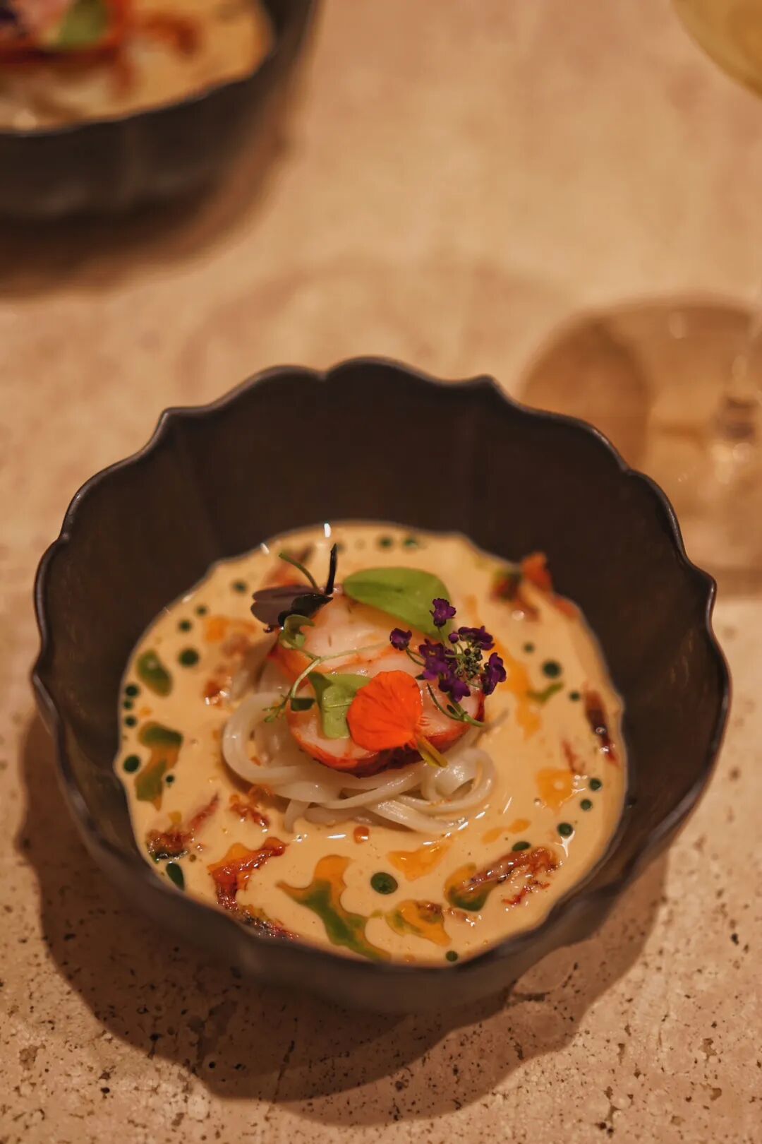 有几道菜颇意想不到,例如可称为招牌菜的乌冬面,这次吃的是豆浆龙虾汤乌冬,以冻汤冷面的形式呈现,在龙虾汤里加入了两种豆浆混合,我想大概一个是为香味,一个是为口感服务,面层洒了炸脆的樱花虾、虾油、龙虾肉作点缀,如此混合搅拌着一起吃,层次就出来了,豆浆的香气改变了龙虾汤单刀直入的风味,在咸香中透着鲜,乌冬条条挂汤,质感是稠滑的,却一点都不会糊嘴粘腻,非常好吃。