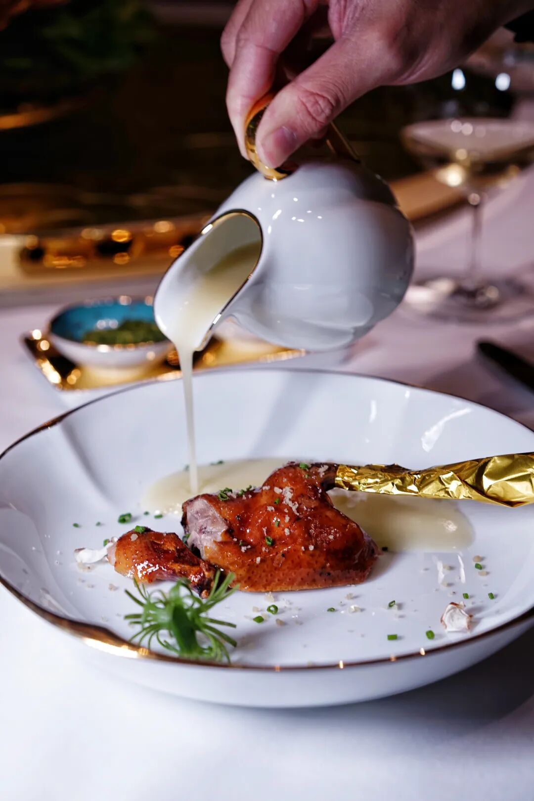 出品稳、用料精的中菜馆,其中柴炉烧腊是餐厅的一大特色,最近一次过去,吃到了主厨用60日大的法国乳羊羊架,加入香料腌制一小时后烧制,最终斩出最肥瘦均匀的部分呈上,法国乳羊肉香而不膻,点晴处是从旁搭配了韭菜汁、酸忌廉青柠檬酱,蘸着吃出不同的风味,搭配一口香烤猪皮,入口嘎嘣脆且溢出猪油香气,正统的粤菜技法搭配西式调味组合,风味就有了变奏。