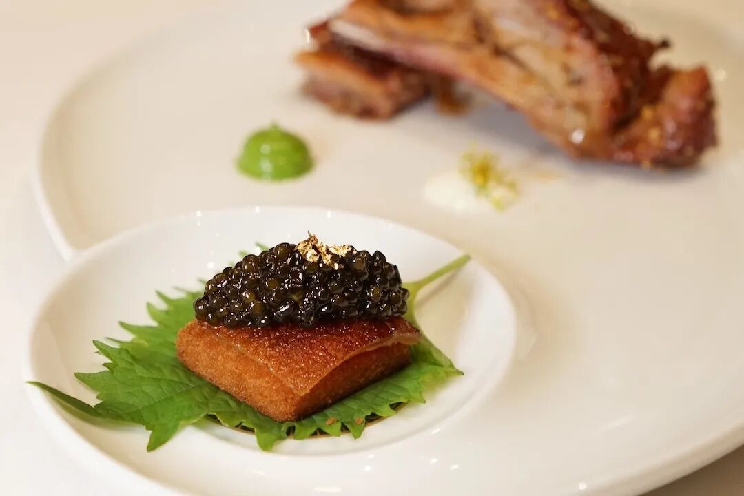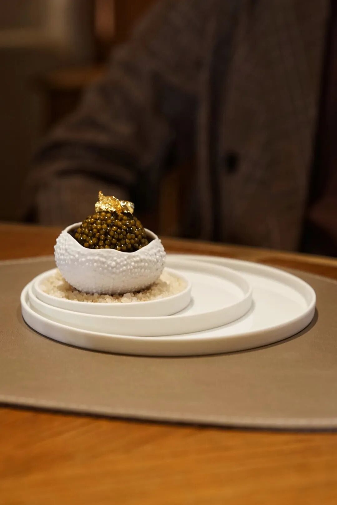 Amber的招牌菜鱼子酱海胆,一座山坡般的鱼子酱,搭配北海道赤海胆、龙虾啫喱,迸发浓烈直接的咸甜鲜味,底层是用椰菜花做的Mousse,用豆奶取代了奶油,细腻度不减。