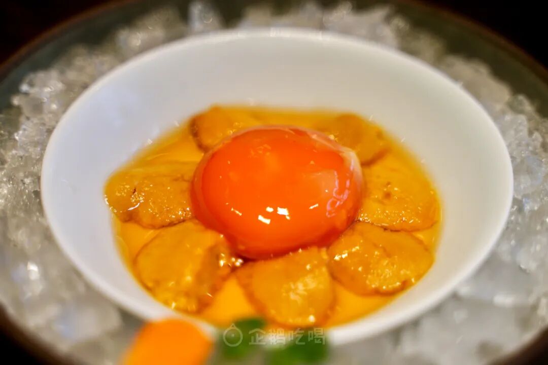 海胆炖蛋/黄酒溏心蛋,类似日式茶碗蒸的做法,炖蛋里加了高汤和海胆,布丁般嫩滑,极度鲜美。