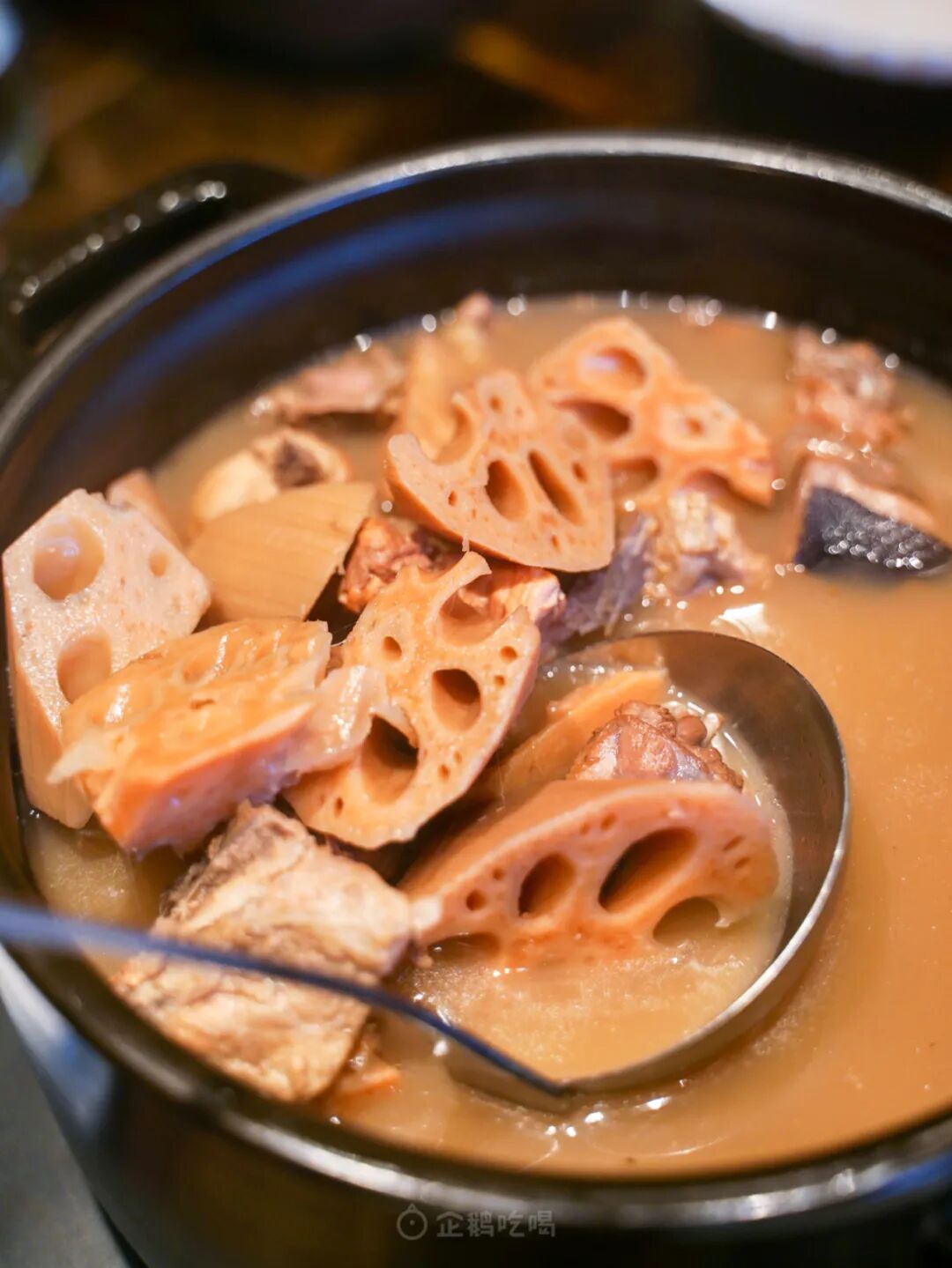 姜汁酒香老鸭炖洪湖藕,湖北人冬日餐桌不可少的藕汤,与杭帮菜经典的老鸭汤结合,下了浓重祛寒的黄酒与姜汁调味,滋味饱满热烈,却又不失平衡。
