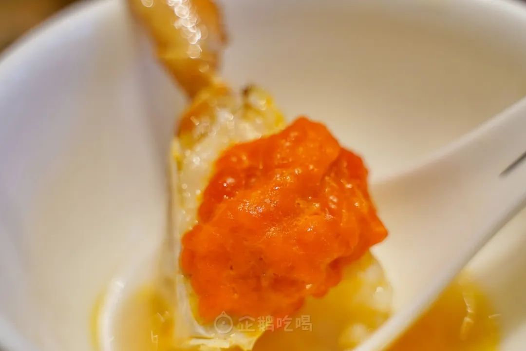 先蒸蟹,至七八分熟时,再把蟹膏放上去;才能保证蟹膏蒸到刚刚凝结的完美熟度;最后再淋上用鸡油和陈年花雕调好的料汁。