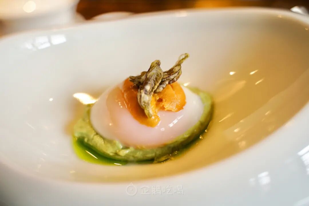 香椿蚕豆泥/温泉蛋,低温慢煮出来的温泉蛋,配上春日蚕豆泥,顶上是香椿挂糊炸脆,再淋一些香草油。