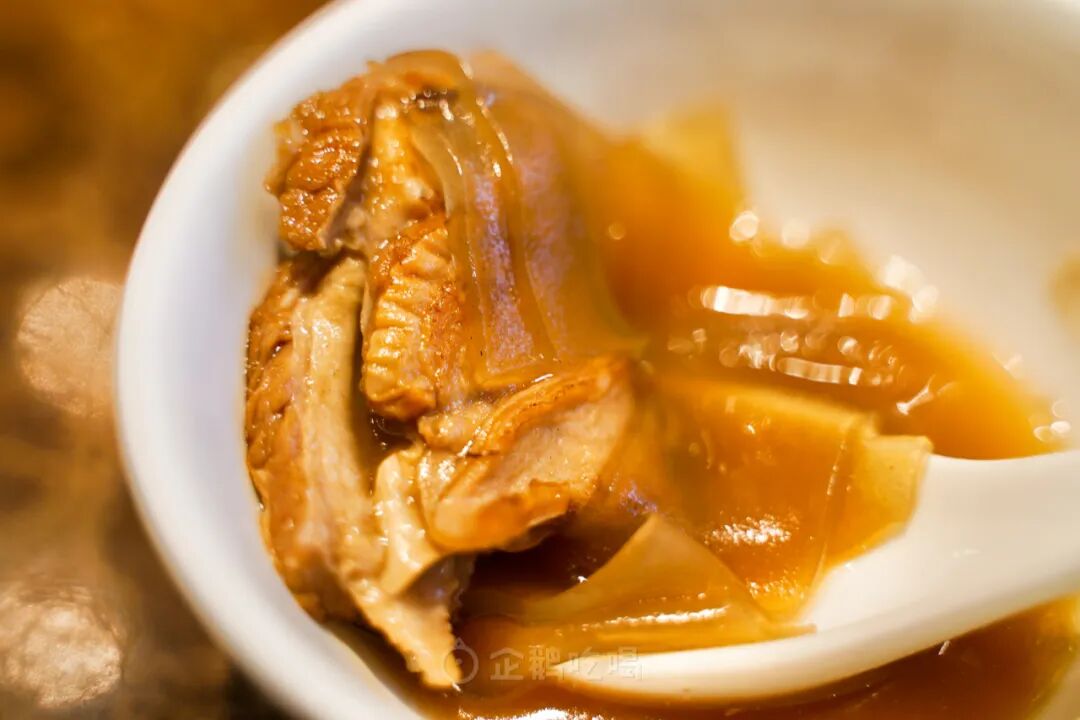 鲍鱼裹满充盈着猪油香气的酱汁,煨得透彻,盘底铺满笋丝,一块肉配两碗米饭都不在话下。