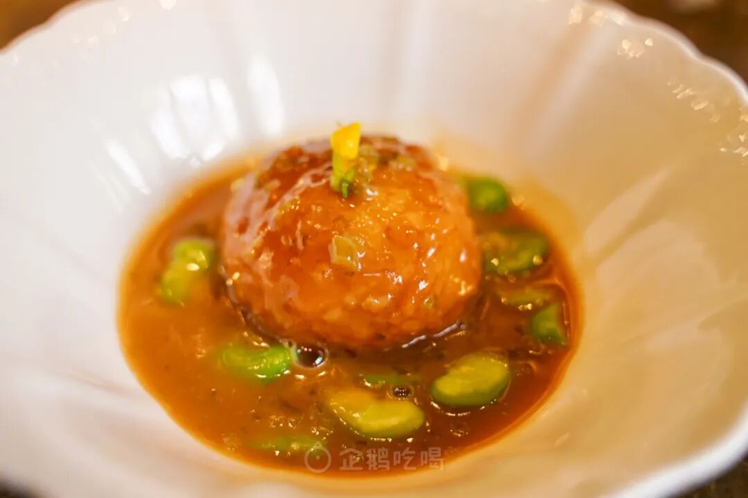 红烧鮰鱼白籽狮子头(春),往传统淮扬菜的狮子头酿入一颗肥嫩滑润的河豚白籽,鮰鱼和猪肥膘都是0.2cm见方的小粒,能吃到几分颗粒感,质地弹嫩,同时入口又如云般轻柔。