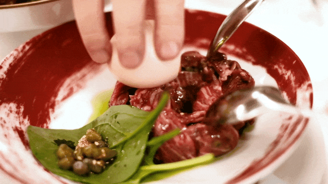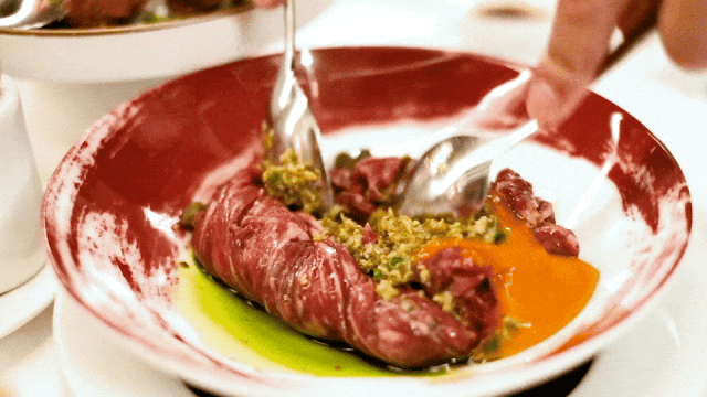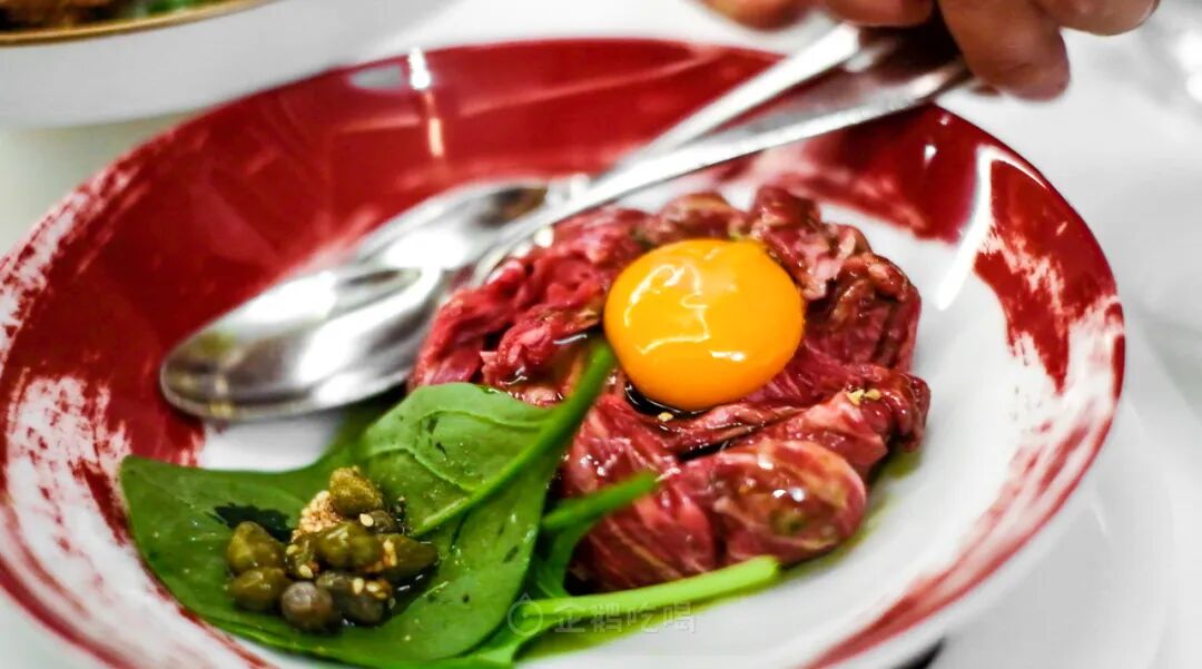 澳洲和牛里脊切成薄片,现场拌入蛋黄,勺与勺轻轻一扯,柔嫩的纤维就被扯断、与配料重组混合。清新的酸度伴随着复合草本气息,流动着隐隐肉香。
