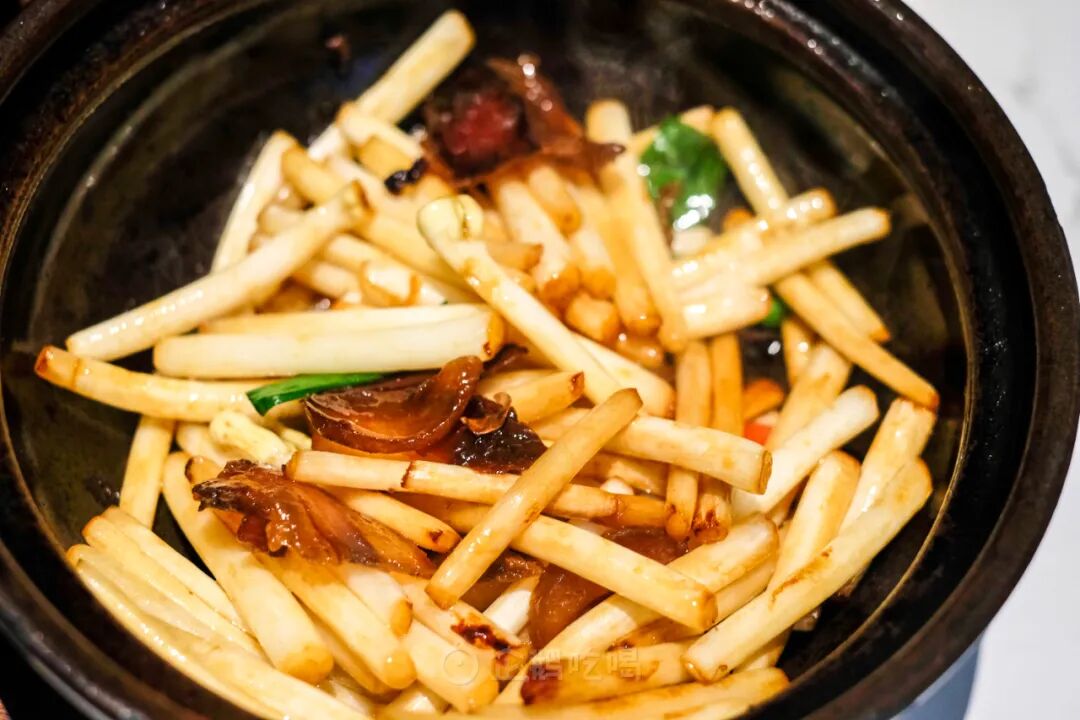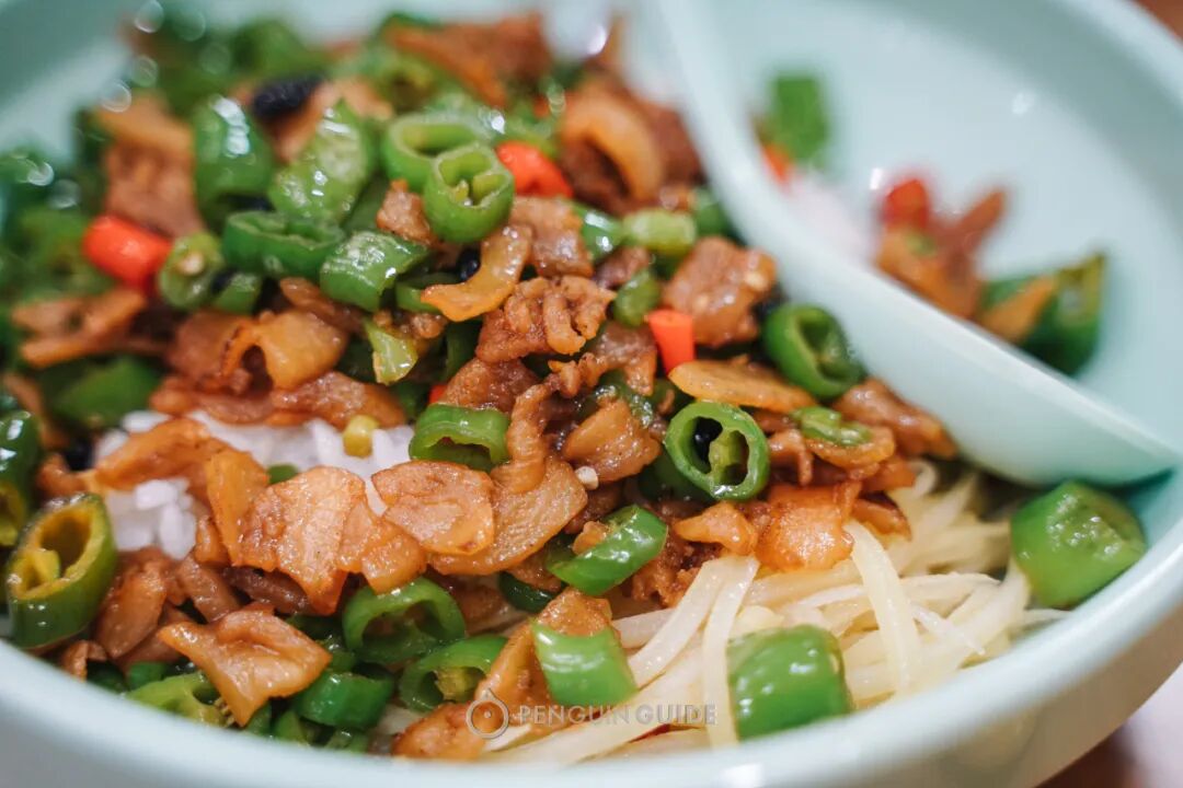 猪肥肉炸到近透明,酥脆脆,嚼起来就是一缕化在舌尖的温热猪油。下了大把青椒红椒,点缀几颗腊八豆与豆豉,层层叠出鲜味辣意。