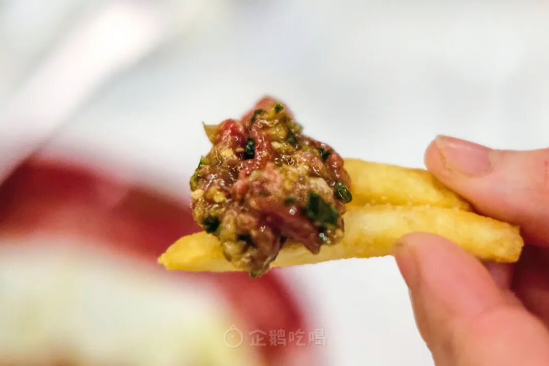 现炸薯条还透着热度,蘸着低温的牛肉塔塔吃,一脆一糯,别有滋味。