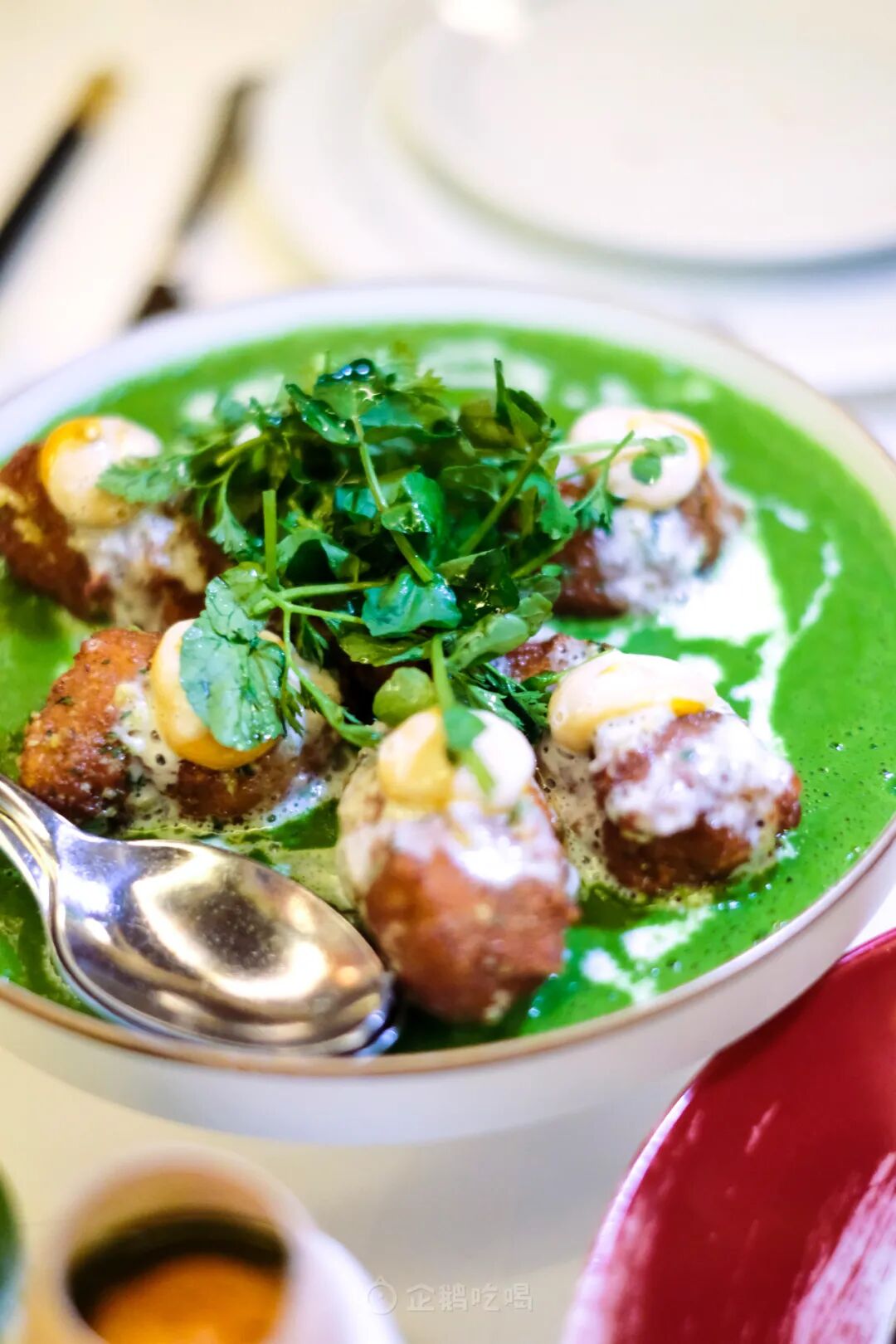 顶上一抹龙虾酱吊起整道菜的鲜味,而绿色的香草酱汁有细叶芹、洋葱的清新香气。