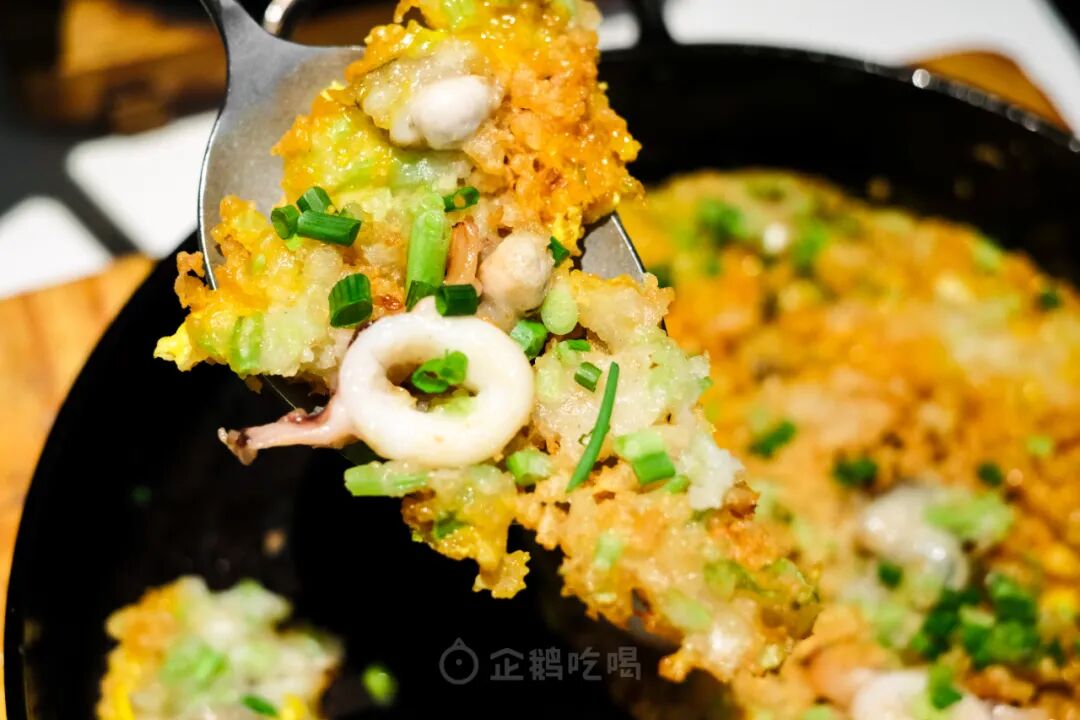 每口都像在吃蛋煎锅巴最精华的边边,鱿鱼鲜甜,嫩滑的蚝仔在口中爆浆,一把葱花调香气,薄、脆、酥、香。