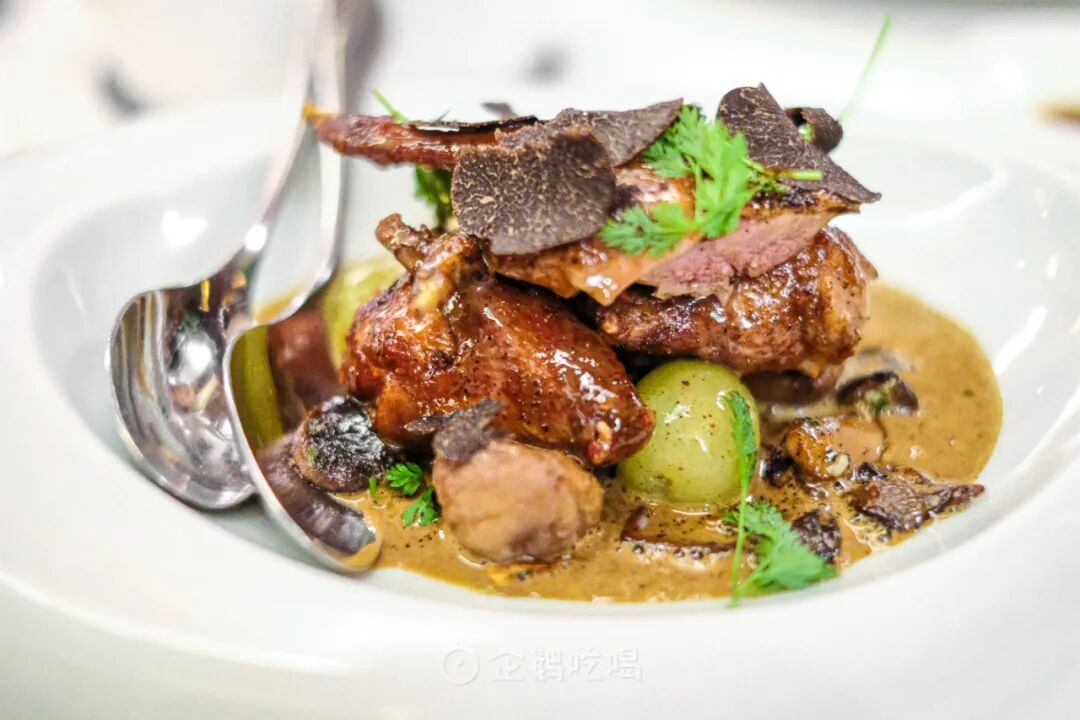 乳鸽的熟度较高(同桌朋友推测近8分熟),肉质依旧是多汁弹嫩的状态,禽鲜味足,配合香气丰厚的干邑酱汁,浓墨重彩的美味。