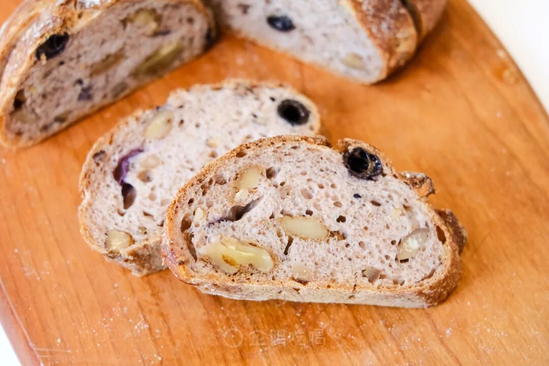大颗的甜栗子、黑加仑与核桃均匀嵌入面包体中,同时也不会掩盖掉面粉香;口感与风味都很多彩。