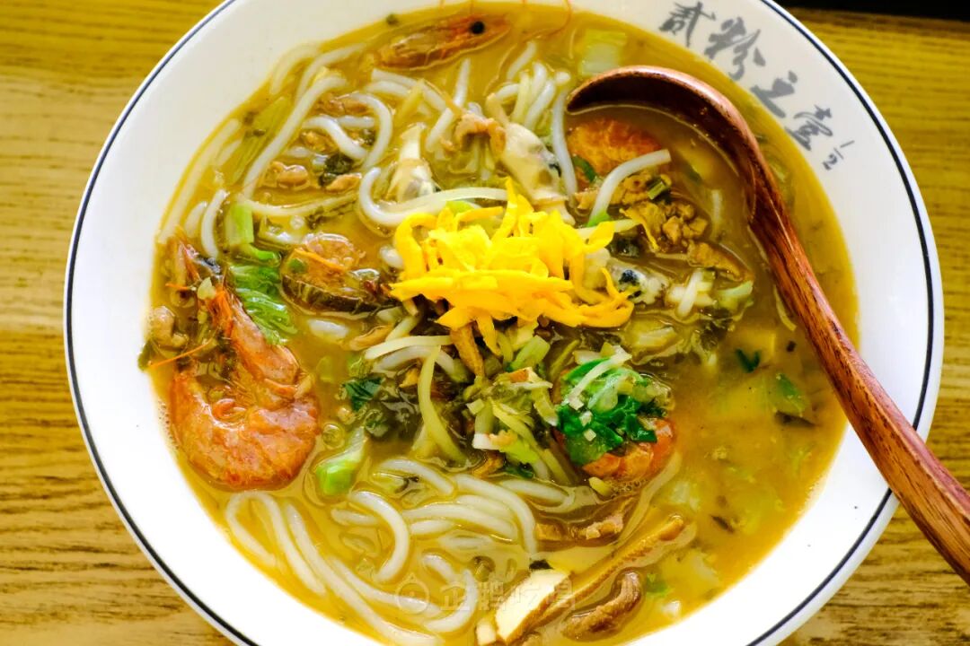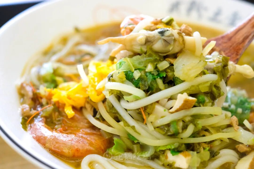 雪菜、烤虾、蛏子、猪油烧出的一碗鲜浓汤底,粗粉挂汤,趁热嗦,称心。
