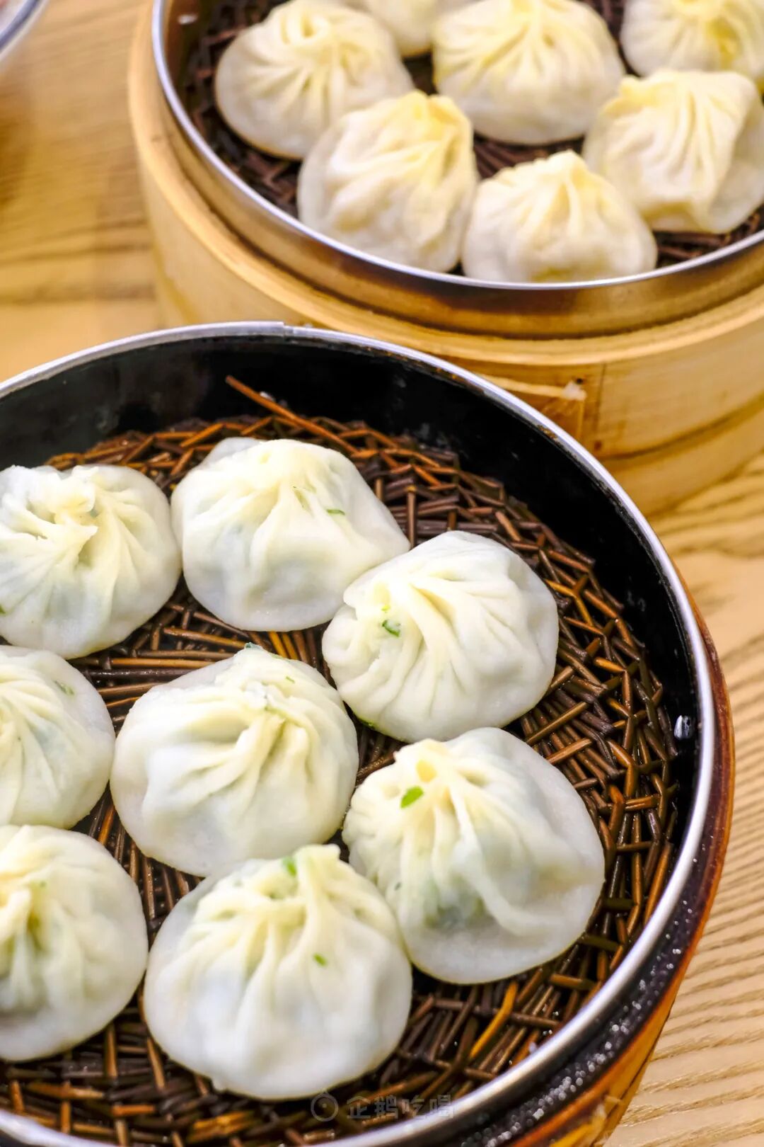 荠菜小笼的则更多几分清鲜,荠菜碎混在肉馅中,时不时还嚼到爽脆的荠菜梗,又添了一重口感。