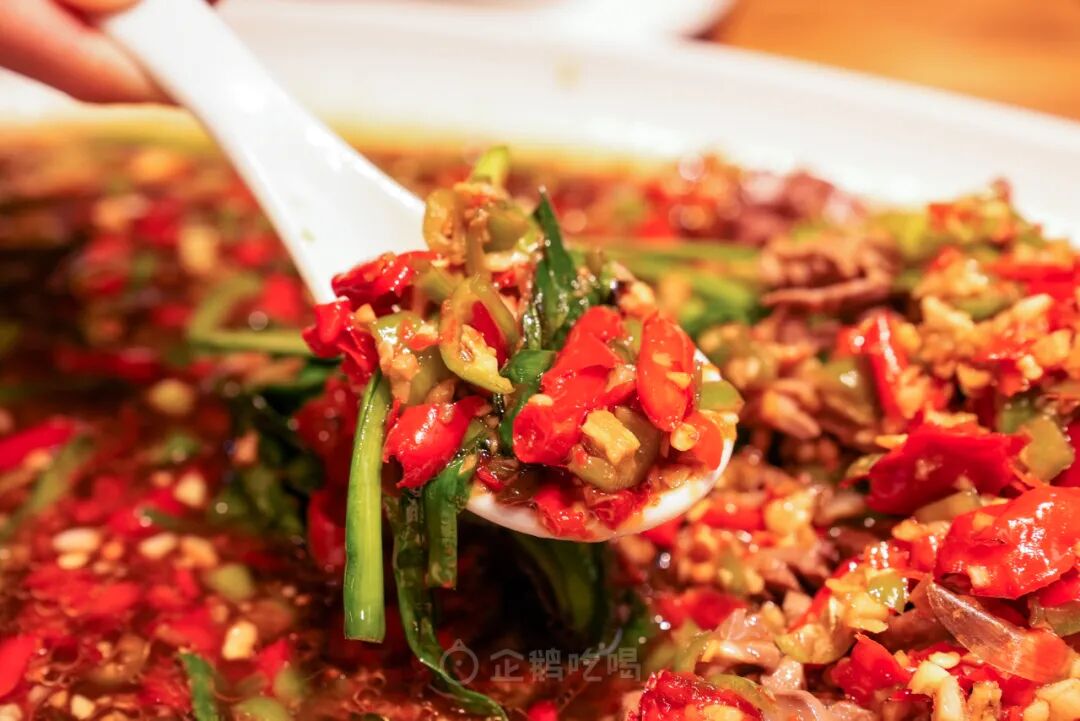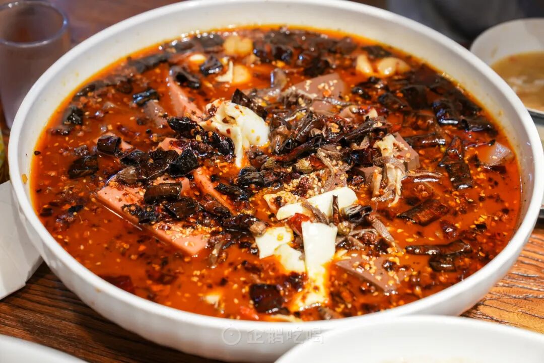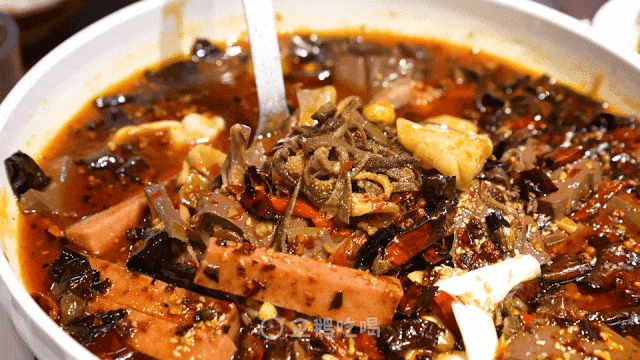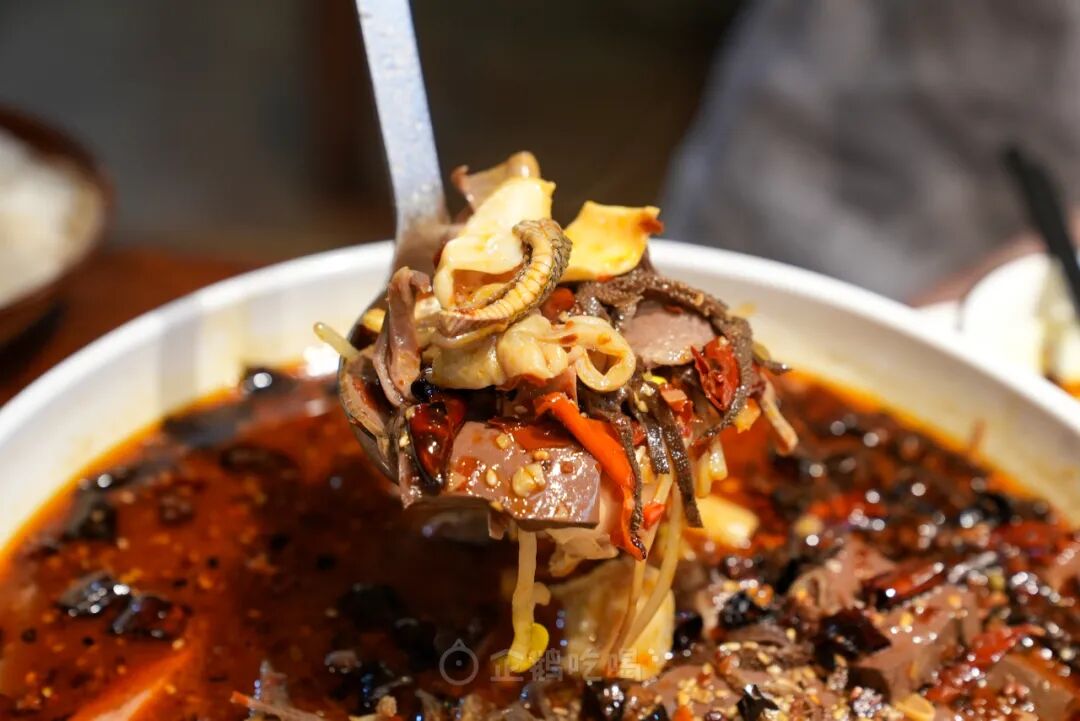 入口是鲜辣感“先发制人”;紧接着不同食材的口感和风味,纷至沓来,是鳝鱼的脆、猪肚的弹、鸭血的滑;最后裹着食材的红油,缓缓释放出干辣椒和干花椒的销魂香麻气息,回味颇佳。