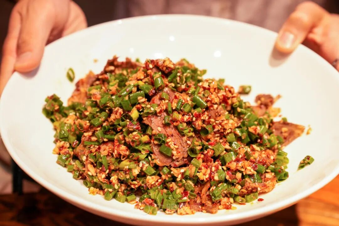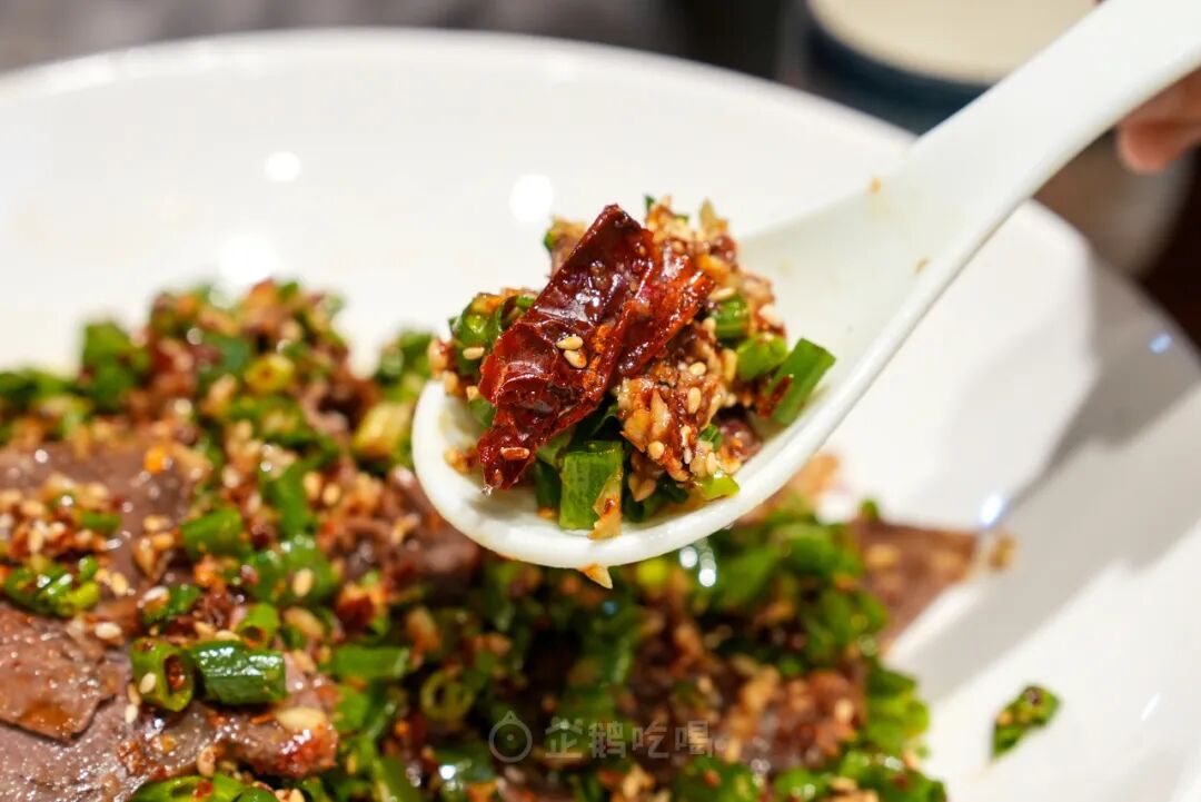 同腰花一样,牛肉也不是用千篇一律的红油去拌,而是撒了大量用油酥过的细碎蒜末、干辣椒、葱花和白芝麻,调味意外也是酸甜口,泼辣中带起了那么一点俏皮。