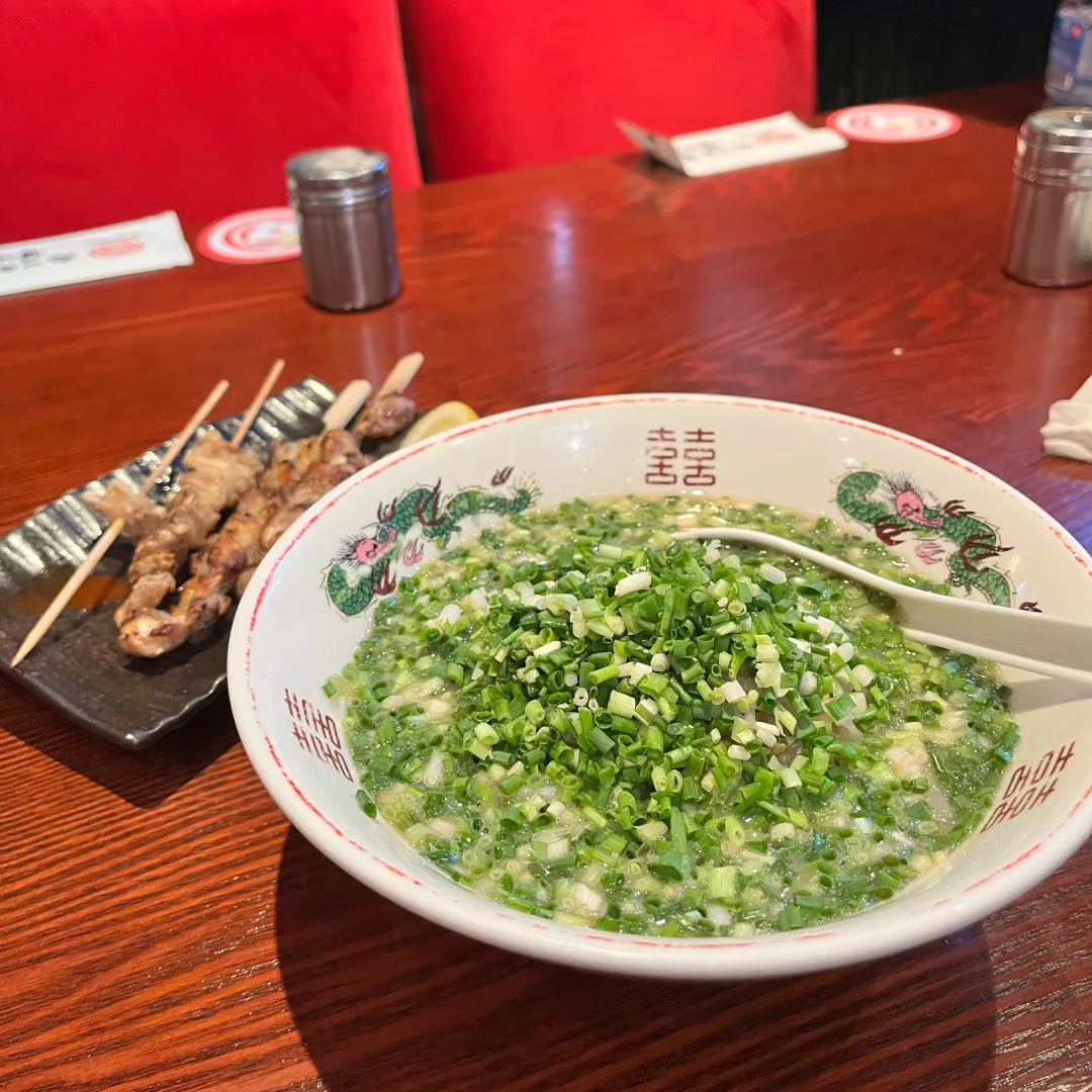 底汤就是正常的豚骨汤,但葱真的是作弊神器:极大提升鲜味(谢谢你,葱),且拉出了层次感,是单纯豚骨拉面的两倍上头。