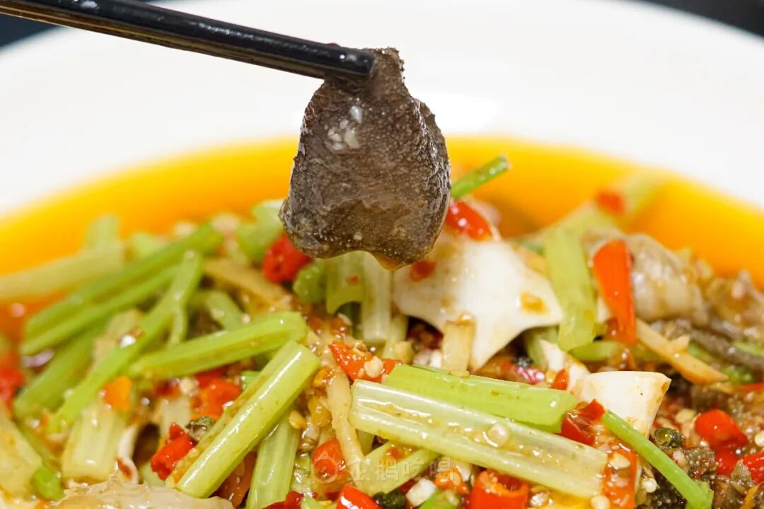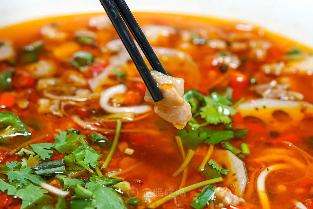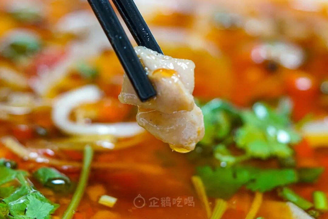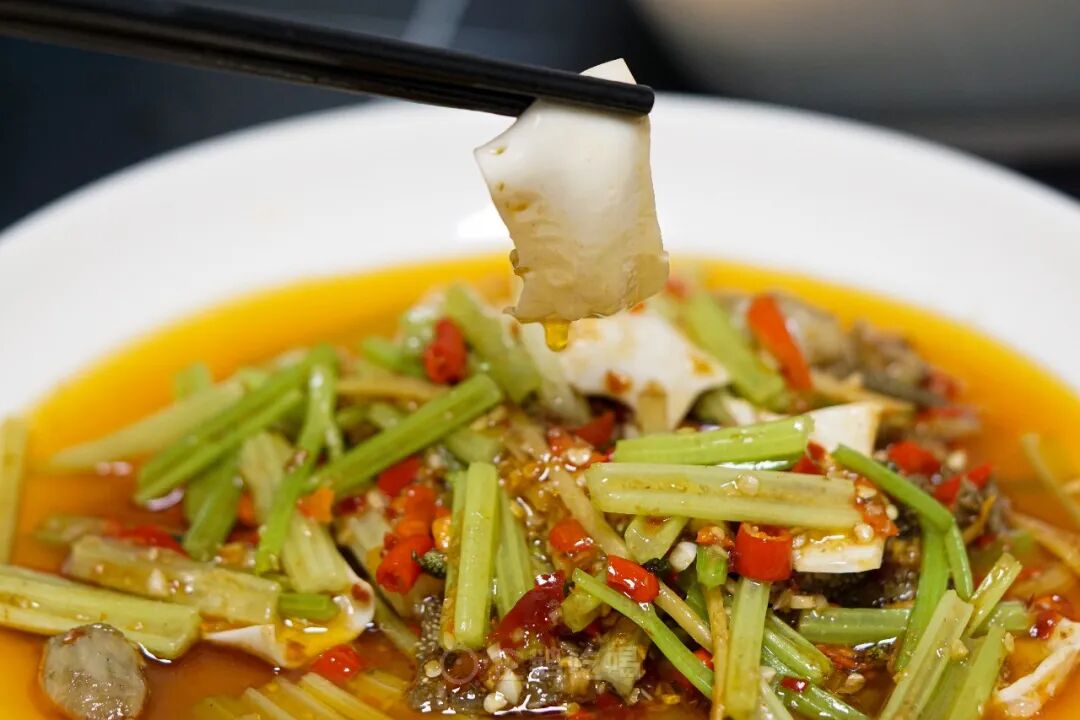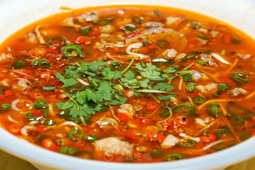 这汤不是寻常郫县豆瓣炒出的红油汤!青海椒、朝天红泡椒、仔姜丝、蒜瓣、自家发酵的豆瓣酱香、醪糟的醇香、炒香后加入高汤和草果香叶等香料熬煮,香得顾盼生辉,香得摇曳多姿。