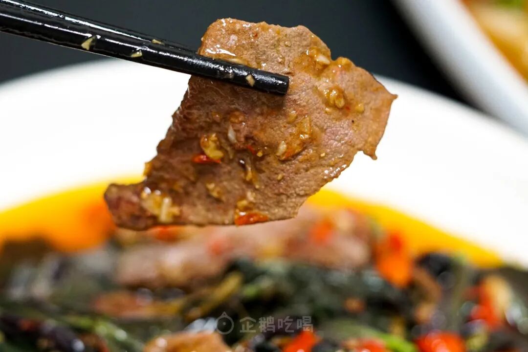 但这家店在传统做法的基础上,烹入了自贡太源井的晒醋,给猪肝和血皮菜引入了一抹微妙的酸味。晒醋的醋酸味并不刺激,还带有微微甜味。陈年期在2年以上,汁相较于普通醋更浓,入菜时能够紧紧地和原料裹在一起,跟猪肝和血皮菜的味道,交融后浑然天成。