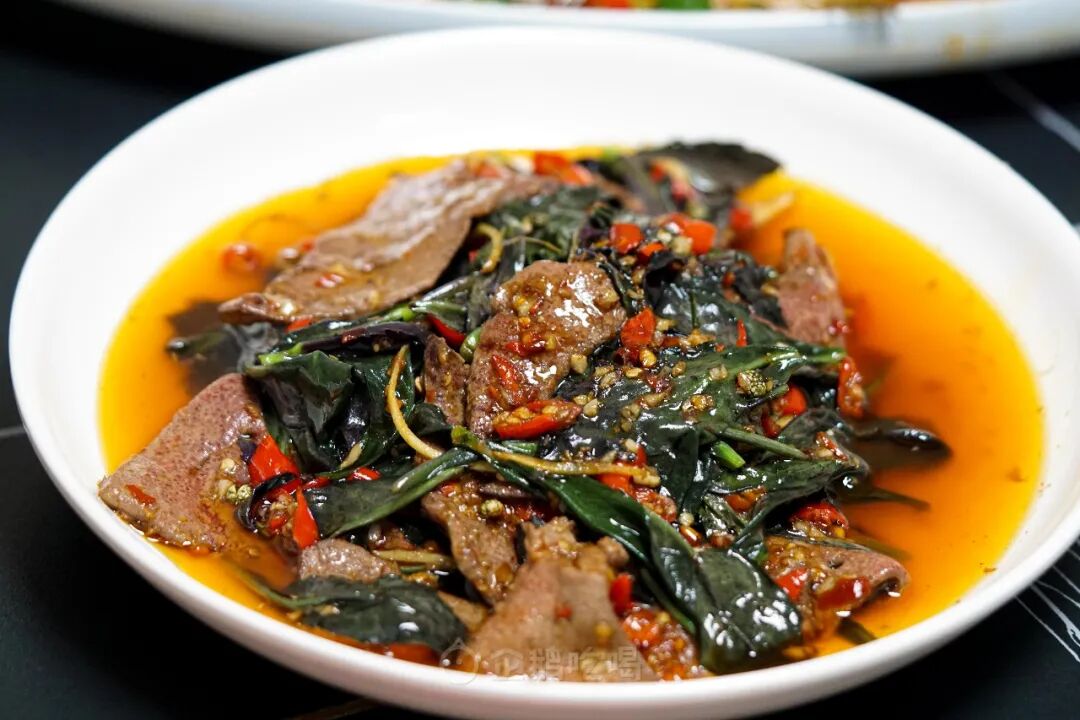 血皮菜炒猪肝,血皮菜又叫红凤菜,广东那边也称为观音菜。四川通常会佐以泡椒、泡姜、豆瓣酱等与猪肝同炒,是一道常见的夏日家常菜。