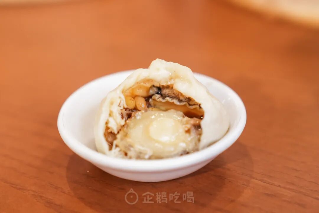 弹韧有劲的小巧鲍鱼,刷得干干净净,一只2枚,再点缀上炸得酥香的火腿丝,酥脆松子,一点陈皮丝,做出一只很有嚼劲的小笼包!(只是陈皮丝放得量每只不太一样,有一只几乎全被陈皮味道压住)。