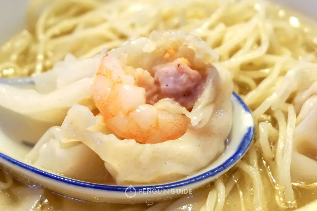面条之下,小而紧致的云吞拖着金鱼尾露出半个头。先尝口汤,鲜味胜于碱水味,但总体滋味仍较为平和。