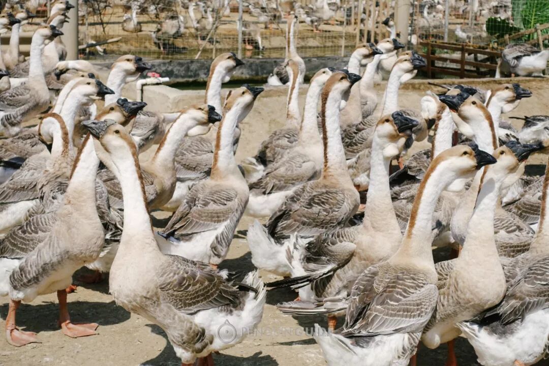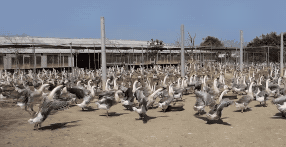 一进养殖场,就能听见它们的洪亮叫声。稍微凑近一点,鹅们就跑得飞快,腿脚可灵活了。