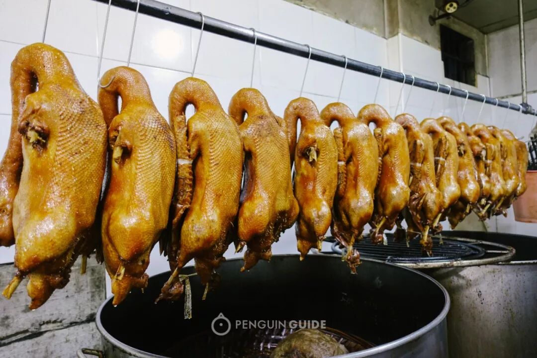 卤鹅最后出锅,排排挂好,也要刷上一层鹅油,保持外皮光润不变干。
