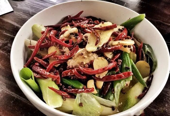 三杯春笋里很舍得放九层塔,香气非常浓烈,麻油香,偏甜。最喜欢酸汤煮桂鱼,鱼肉极绵细,处理得很利索,但桂鱼本身味道不足,主要表现在质感,而所有丰富的味道都来自这锅酸酸辣辣的金黄汤底,入口是鲜香的酸,吃完舌头辣,接着嘴唇麻,青花椒深蕴的椒香气是点睛之笔。