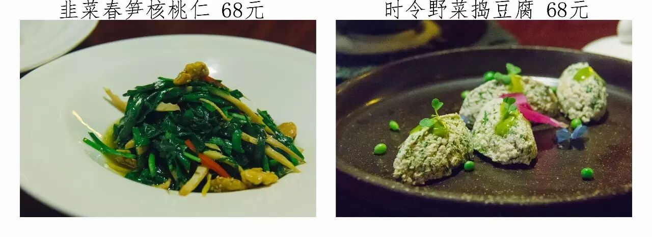 也是没有韭菜啊、春笋啦、石磨豆腐更懂春日的轻灵了。韭菜春笋核桃仁用气味很强烈的菜籽油炒,和蔬菜们很搭,春笋切丝,核桃仁裹了糖衣炸得香脆,吃春天的韭菜,嫩度和脆度完美得和其余季节里吃的仿佛不是一样东西。野菜捣豆腐也是别有天地,野菜分量不多,不至于抢了豆腐的原味,但另外用野菜调了酱汁淋了一遍,加了些黑松露,口感朴素又丰富。