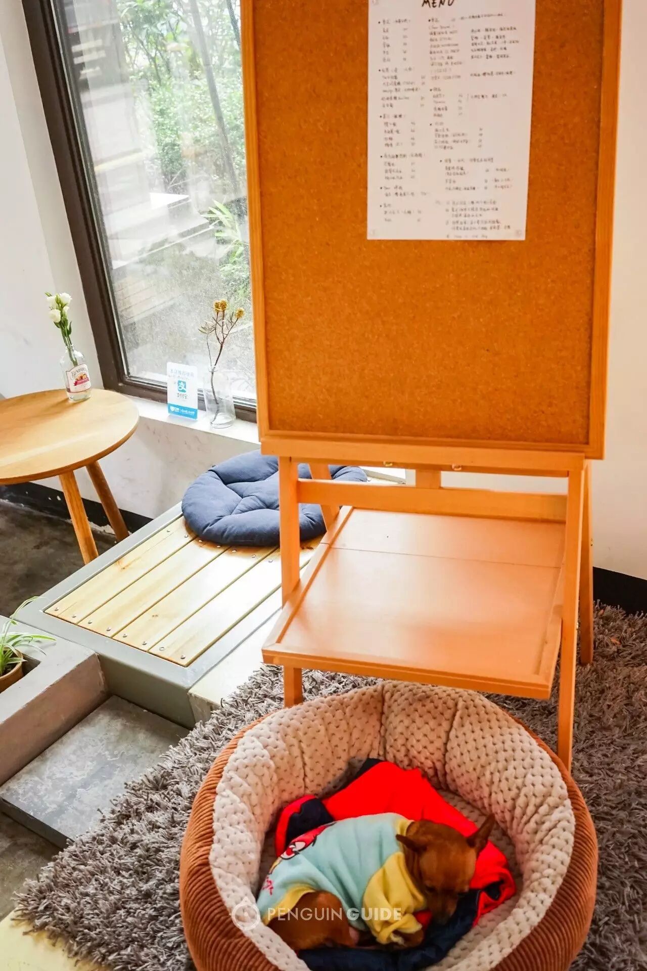 渐渐的入口采用了水泥质感的极简风,看起来有些冷冽。不过店里却是暖色调吧台,菜单板下还窝着一只小狗,让人顿觉心情明朗。
