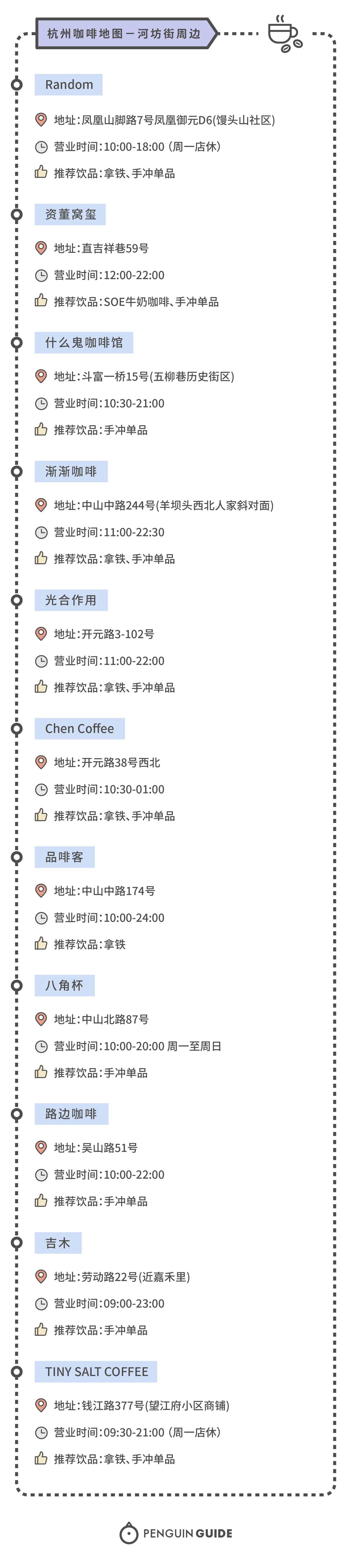 除了以上六家,杭州老城区河坊街周边还有许多值得一试的咖啡馆,企鹅君整理了一张清单,长按图片就可以保存起来,留待下次探店啦。