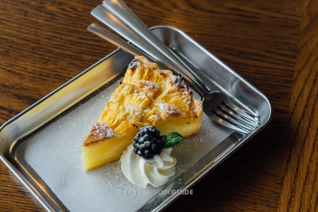金灿的凤梨挞装在银色盘子里,吃起来有日式甜点克制的甜,果味浓郁,凤梨的纤维感也恰到好处。拍了几张照的功夫就被同桌火速瓜分完毕,我就吃了一口啊哼!