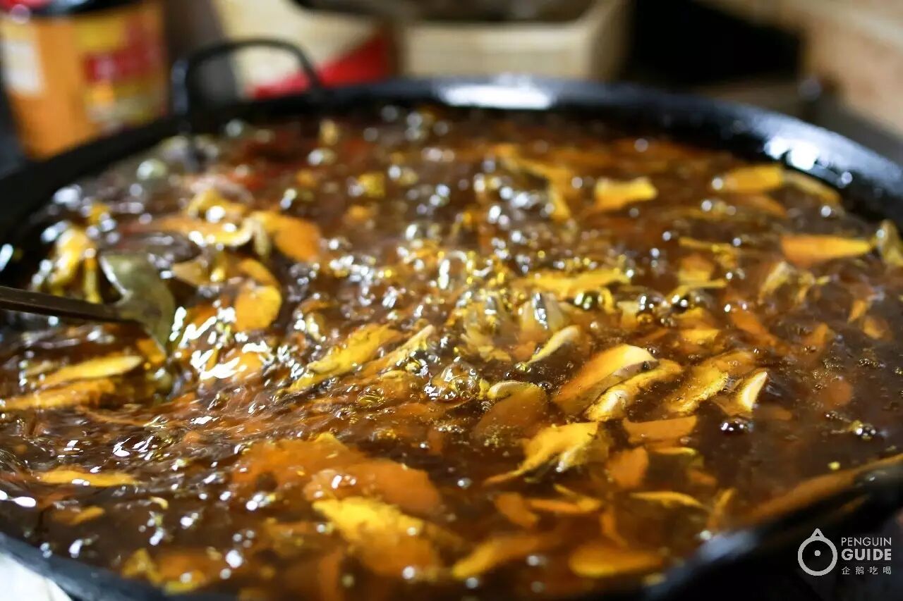 比较有代表性的焖肉,把猪五花肉用特制的卤料焖煮,香糯酥烂,肉皮Q而不韧,肥肉油而不腻;爆鱼,大青鱼鱼块炸后用特制的卤料浸透。