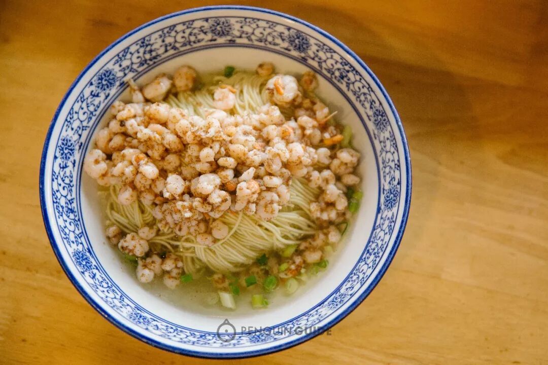 要表白极细的龙须面,蛋香有劲道,不粘不腻,可以慢慢拌,让虾籽裹在面上,吃得很落胃。