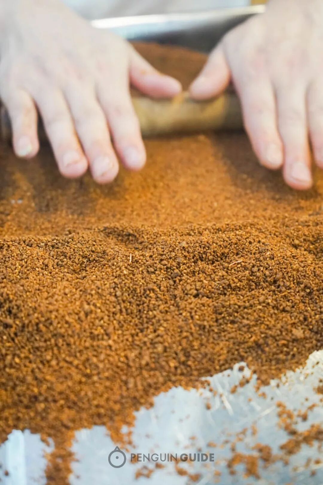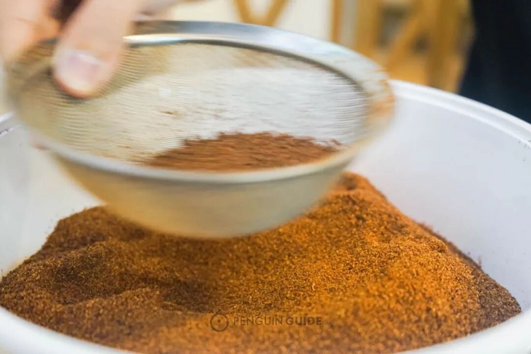 没完呢,虾籽过油会结团,颗粒较粗,还需重新磨碎: