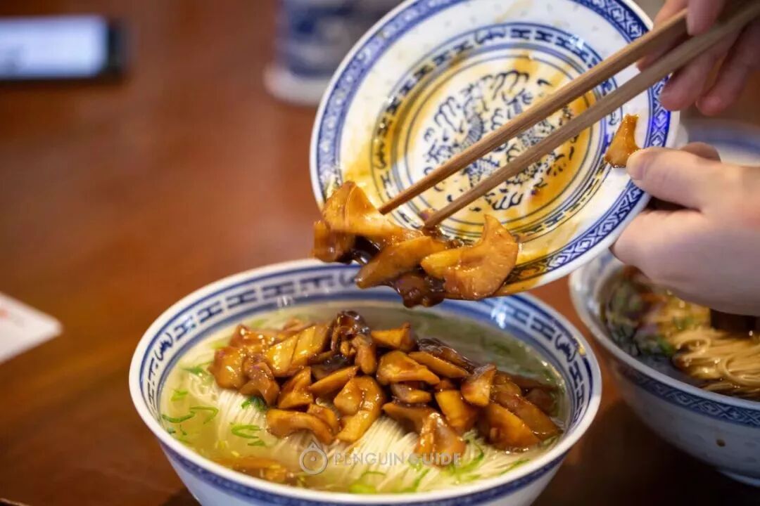 同得兴这一碗,厚度近两厘米的大块焖肉,在鸡架鳝鱼猪骨高汤吊出的红汤中慢慢融化,软糯烂嫩,在口中可以抿化。