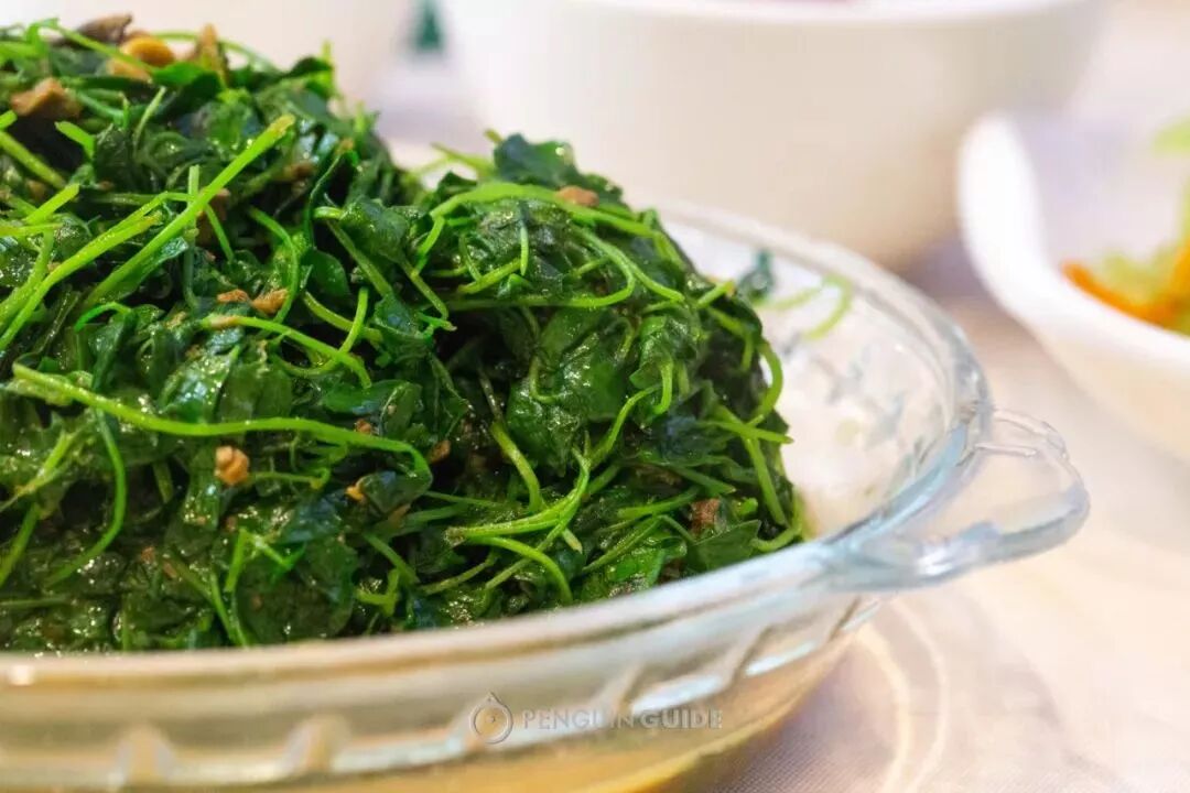 樱桃肉衬在糯糯的鸡毛菜中,红艳娇憨:
