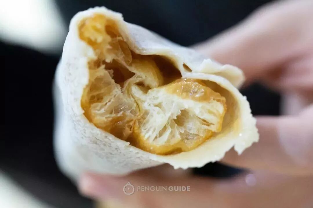 荷叶饼美人是荷叶饼里加了脆油条,刷上特制的甜酱汁,四块钱的一口饼里,甜咸香脆嫩都能集齐!
