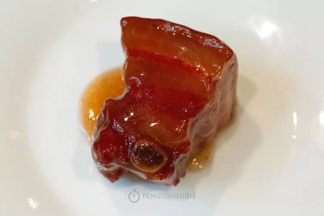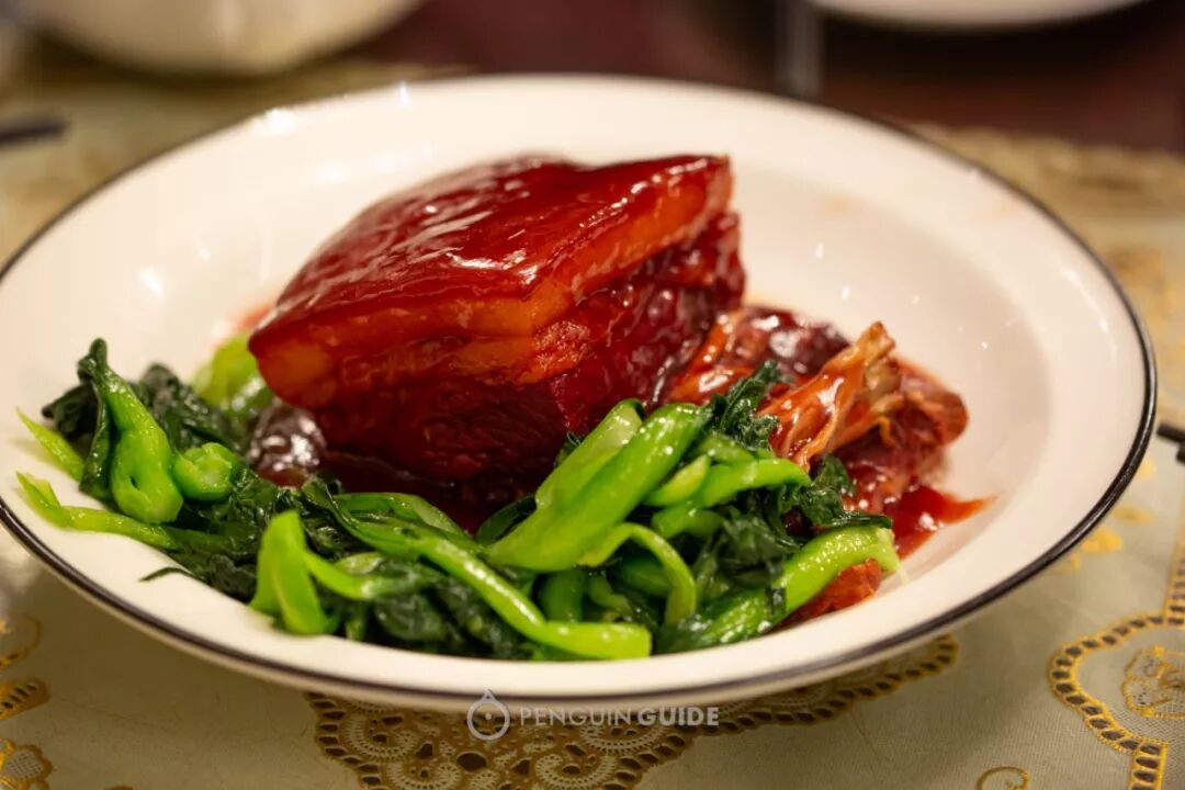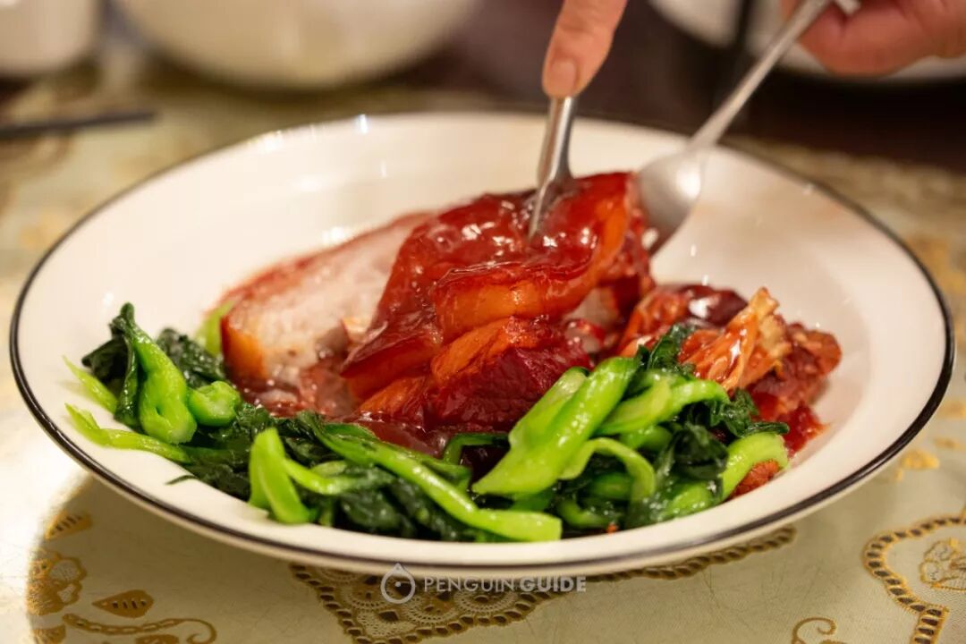 新聚丰的这块,猪皮炖得嫩而糯,肥肉早已蒸出多余油脂,软到只用一副刀叉,转眼拆分完毕。