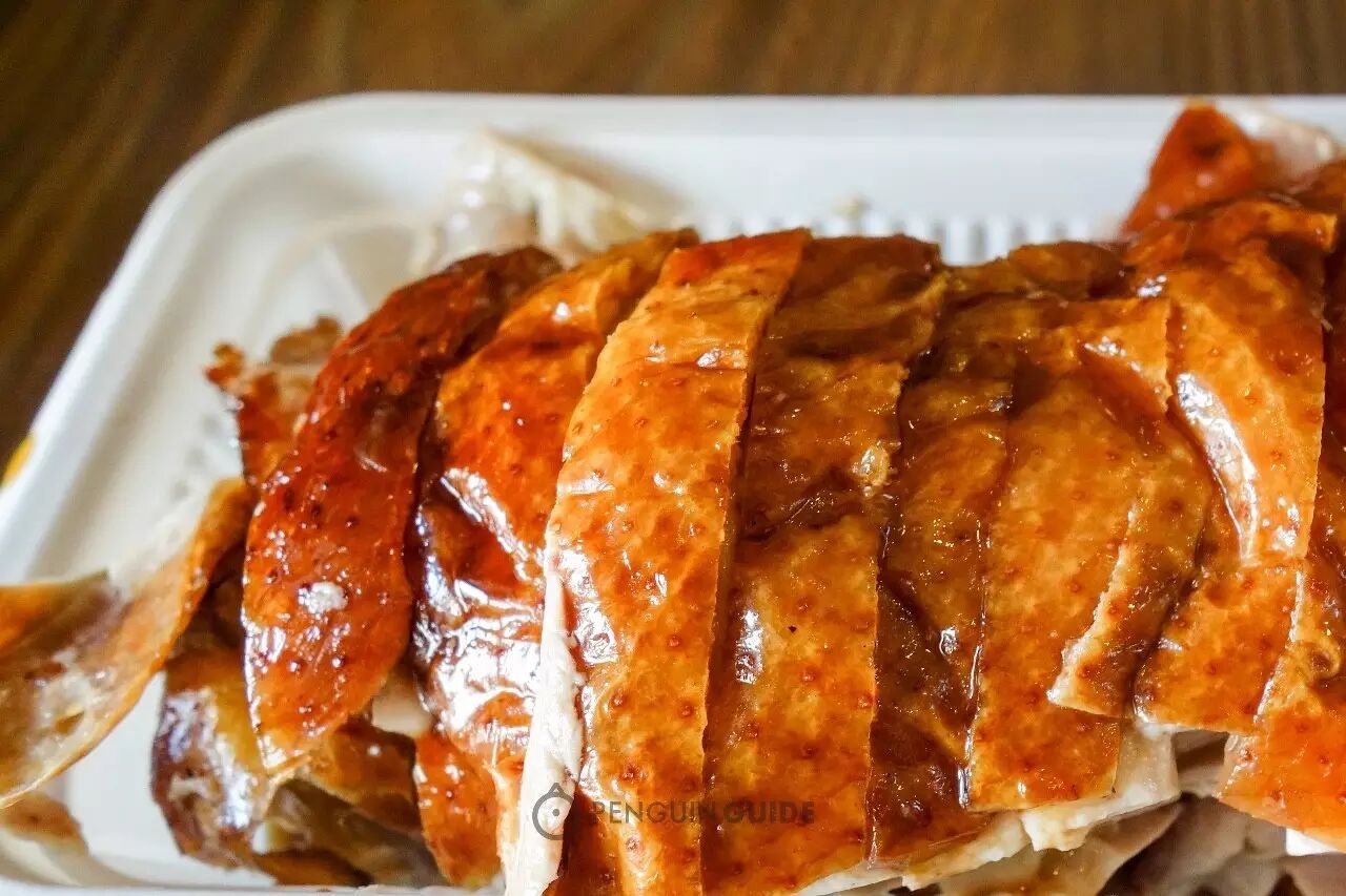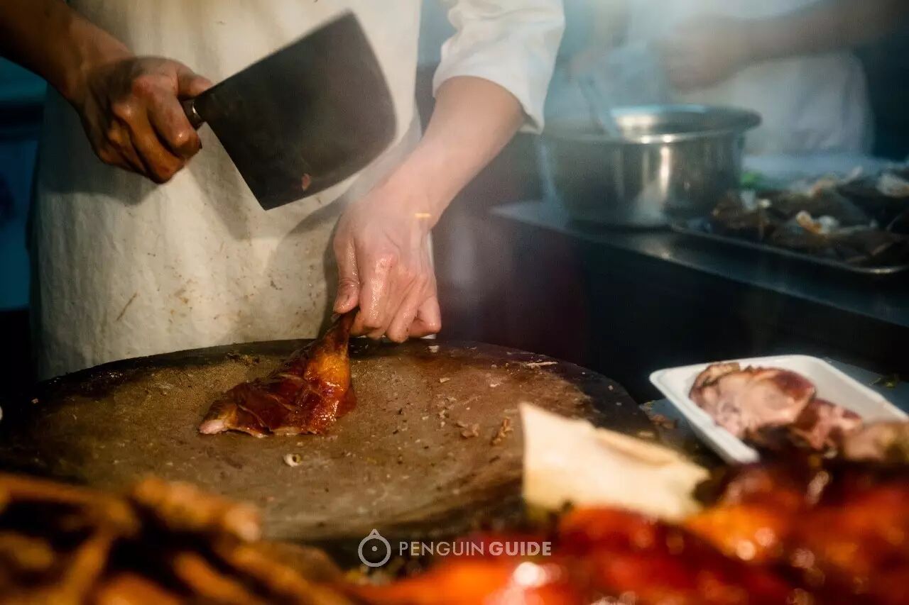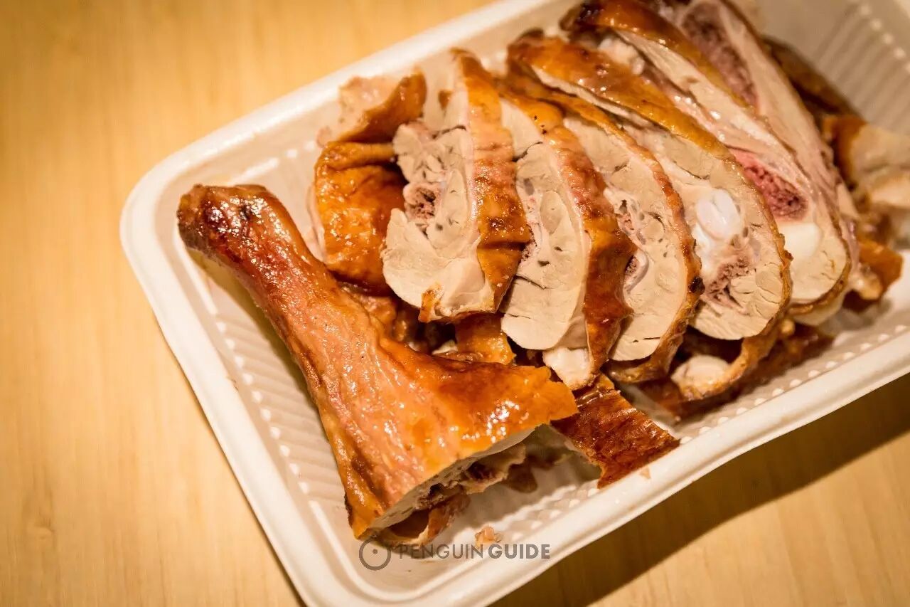 鲜出炉的烤鸭,稍微放置一下后腥味散去,带着恰到好处的温度。想吃肥一点的可以斩前脯(鸭胸到腰),喜欢有嚼劲的可以斩后座(腰到鸭腿的部分)。金黄的鸭皮烤融了脂肪,变得焦香绵脆;鸭肉的汁水被好好地锁住,一嚼满是滑嫩鲜香。
