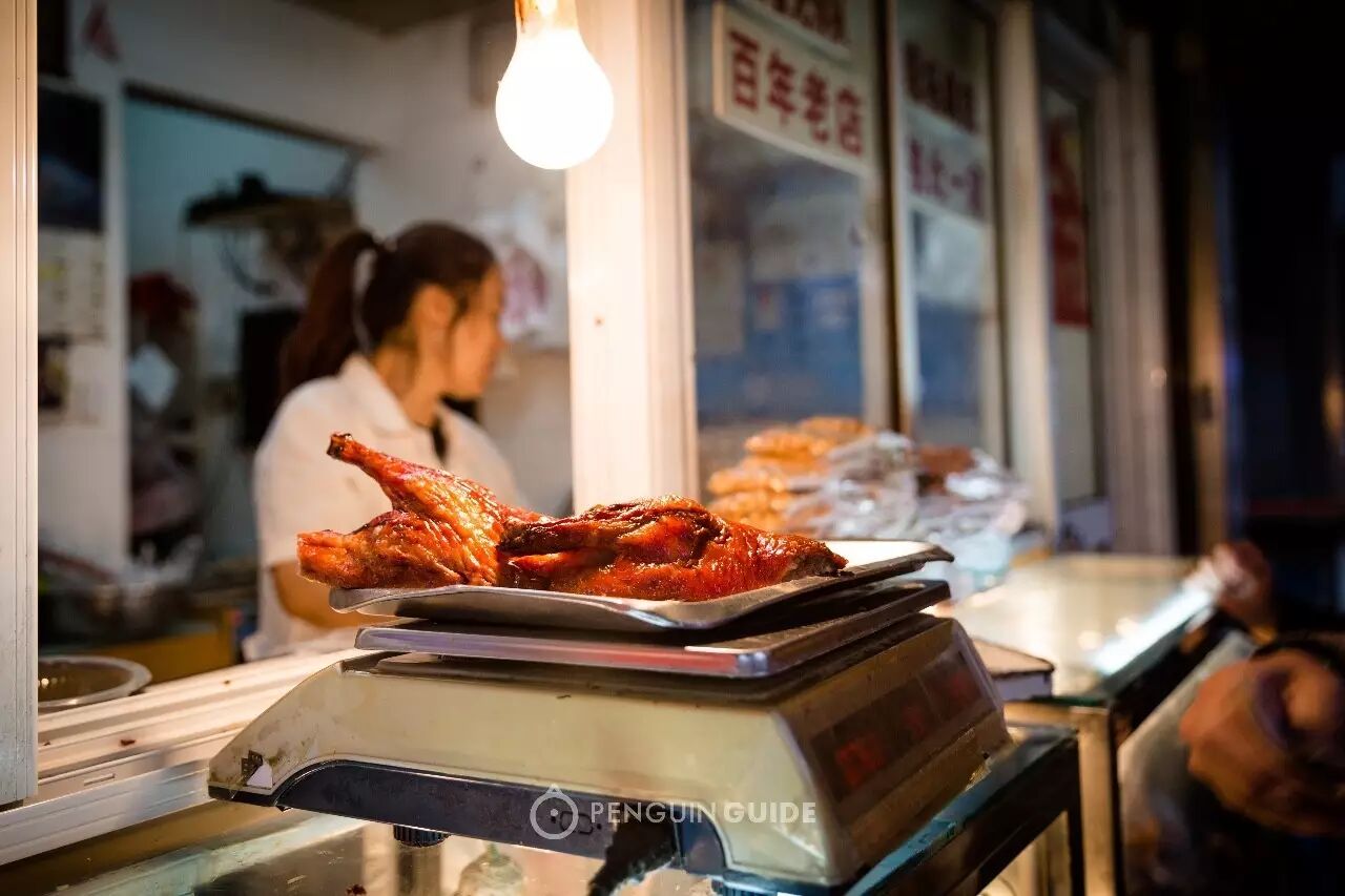 店面超级小,两三个人在里面就转不开身。烤鸭和盐水鸭高高地垒在橱窗后面,一红一白,分外诱人。