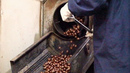 等了十几分钟,刚炒好的栗子就会从混凝土机器里扑啦啦地滚出来,裹挟着浓郁的香气。