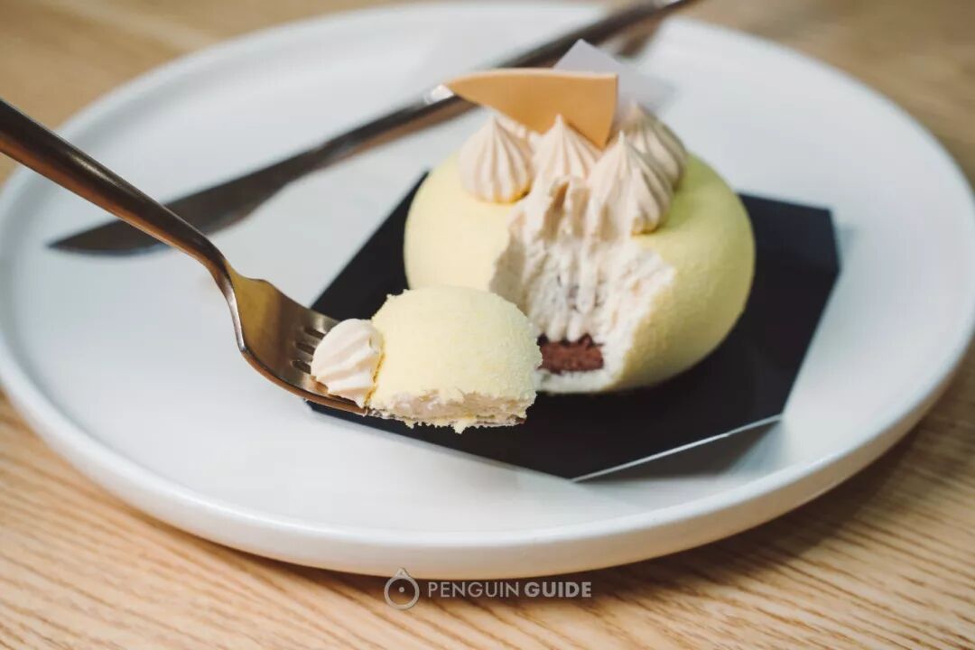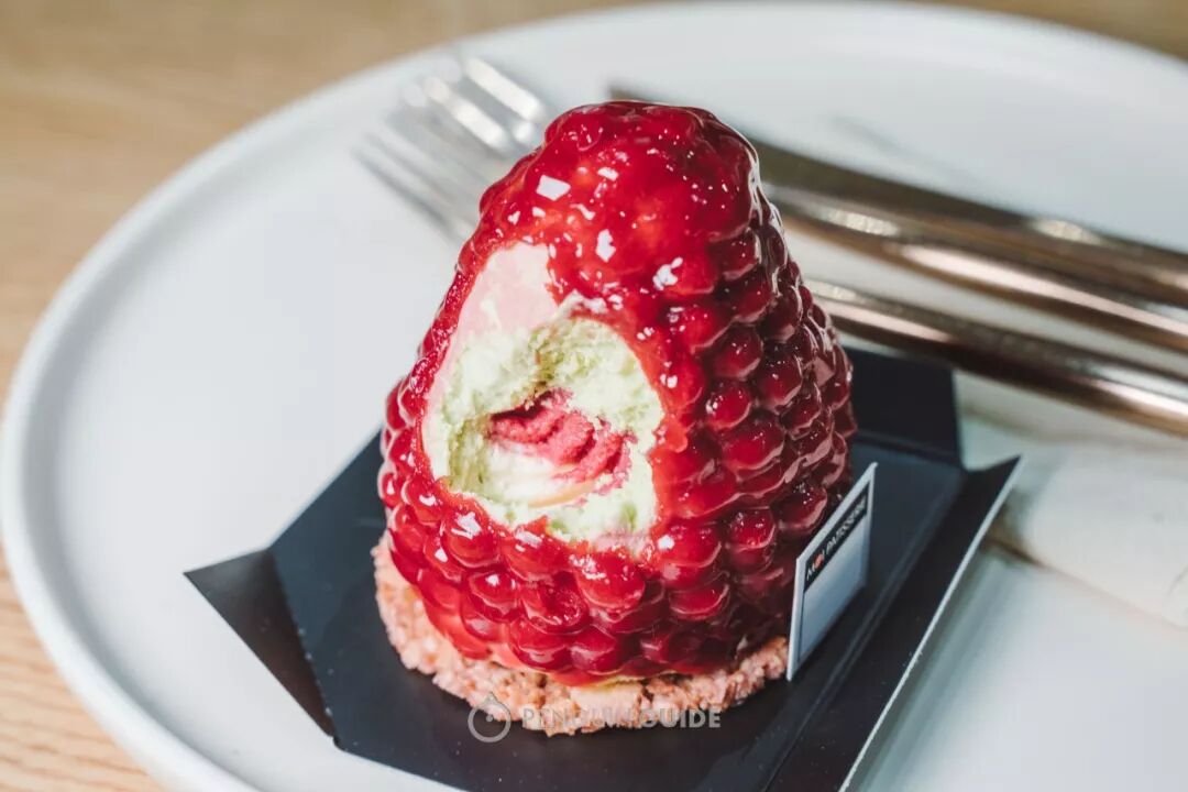 喜欢这块Chloé,做成了亮眼的树莓状,用勺子轻轻撬开,里面是树莓慕斯夹开心果慕斯,酸甜交织,单吃一整个都不会觉得腻。